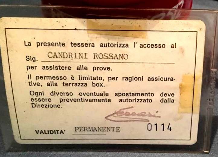 Quelques lignes à l’intérieur, toujours à l’encre violette, accompagnaient une carte d’entrée permanente sur la piste de Fiorano inaugurée quelques temps auparavant.