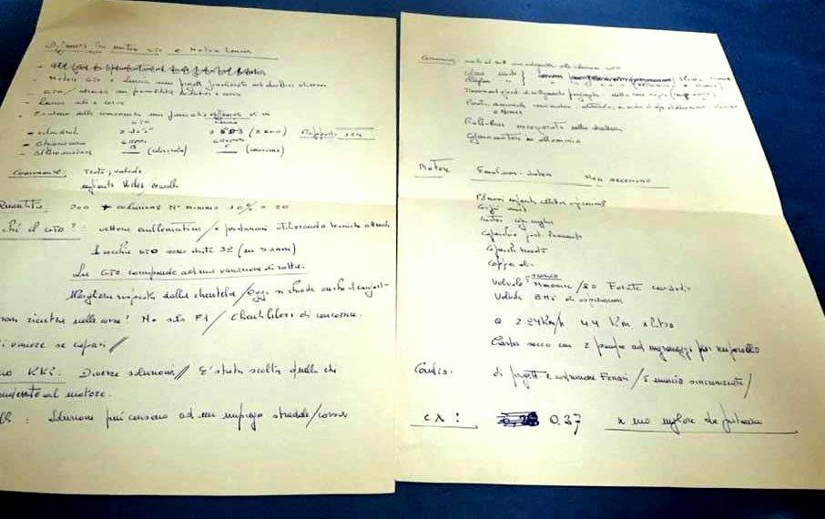 Curieusement J’ai trouvé, oubliées dans la boite à gant deux notes manuscrites d’observations et de comparaisons entre le moteur utilisé par la 288 GTO et le 8 cylindres analogue suralimenté qui équipait le groupe C Lancia.