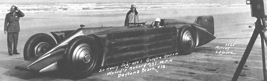Si l’on excepte la marque de René Thomas sur Delage, qui tint seulement six jours en 1924, le record de vitesse sur terre ou LSR (Land Speed Record) semble devenu une propriété anglaise dans les années vingt. En l’espace de six ans, de 1922 à 1928, les Britanniques le font progresser le de 215 à 333 km/h. Mais en avril 1928, les Américains le leur chipent pour à peine 1 km/h : oh, shocking ! Hors de question d’en rester là. Il s’agit de le leur reprendre, qui plus est chez eux, puisque les records ont trouvé leur nouveau terrain d’élection : la plage de Daytona en Floride, qui a supplanté les plages européennes, devenues trop courtes avec l’augmentation des vitesses.