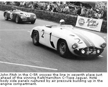 « Rolta » et « Milton » ! Confusion dans mes oreilles d’enfant. Ils n’étaient pas connus comme Fangio, Ascari, Collins, ou Behra ? Bah ! Ca ne les avait pas empêchés, à 16 heures le dimanche, de battre le record à la distance, à plus de 170 km/h de moyenne ! Sans doute, entre autres, grâce aux freins à disques de leur Jaguar C n° 18. Et qu’est-ce qu’elle était belle ! Il y en avait une autre, la n° 17, tout aussi belle, qui se classait 2e. Elle était conduite par un certain Walker et par un jeune Anglais très doué, dont on disait monts et merveilles. Il s’appelait Stirling Moss. La troisième Jaguar C, n° 19, conduite par Whitehead et Stewart, se classait 4e, seulement devancée par une énorme voiture américaine (blanche à bandes bleues, couleur des Etats-Unis en course, me faisait observer ma grande sœur, mise au parfum grâce à papa) : la Cunningham n° 2, dont le gros moteur V 8 produisait un martèlement d’enfer à chaque coup d’accélérateur, et qui était conduite par deux Américains, Fitch et Walters.