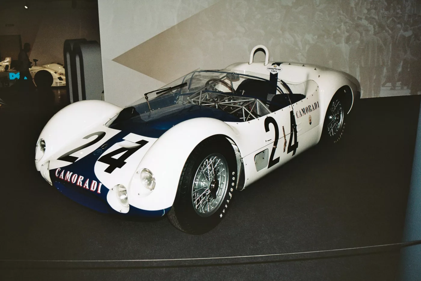 Maserati, la prestigieuse firme de Modène a rarement brillé aux 24 Heures, tout au moins pour ses résultats puisque sur ses 27 engagements, entre 1954 et 1965, elle n’obtint que 4 classements dont une 4ème place. Cependant Maserati engagea souvent des voitures de conception fort originale telle la Tipo 61. Dans le but d’aboutir au meilleur compromis possible entre légèreté, rigidité et aérodynamique, l’ingénieur Giulio Alfieri imagina un châssis multi-tubulaire caractérisé par un entrecroisement de 200 tubes de fine section aboutissant à une sorte de cage qui ne pesait que 35 kilos. La voiture fut vite baptisée « Birdcage » (cage à oiseaux). La disposition inclinée à 45° à droite d’un moteur 4 cylindres en ligne de 2890cc permit d’abaisser notablement le centre de gravité. Ainsi favorisée, la tenue de route fut encore améliorée par la position du moteur placé très en retrait de l’essieu avant. Par ailleurs, un pare-brise fortement incliné et plongeant vers l’avant fut adopté laissant apparaître les éléments tubulaires du châssis. Cette voiture fut engagée en 1960 par l’écurie Camoradi (Casner Motor Racing Division) de Lloyd « Lucky » Casner et confiée aux américains Masten Gregory et Chuck Daigh. Masten Gregory prit la tête de la course pendant une heure et établit le record du tour en 4’04’’ à la moyenne de 198,605 km/heure.