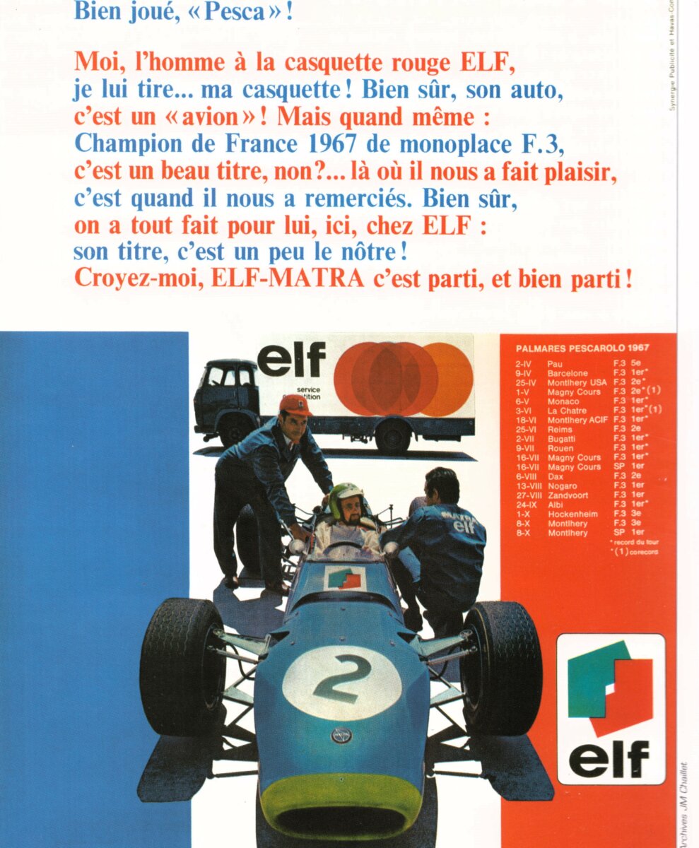 Depuis 1967, le pari de Elf est gagnant. Trois saisons qui se sont avérées presque miraculeuses tant les résultats ont été brillants. Titres en F3, F2, F1. Moteur V12. Premiers gros espoirs en Endurance. Le partenariat est tressé de lauriers. Sans compter les accords avec Renault en Coupe R8 Gordini, avec la Formule France et avec Alpine dont les berlinettes pilotées par Vinatier, Andruet et Nicolas s’imposent dans tous les rallies.