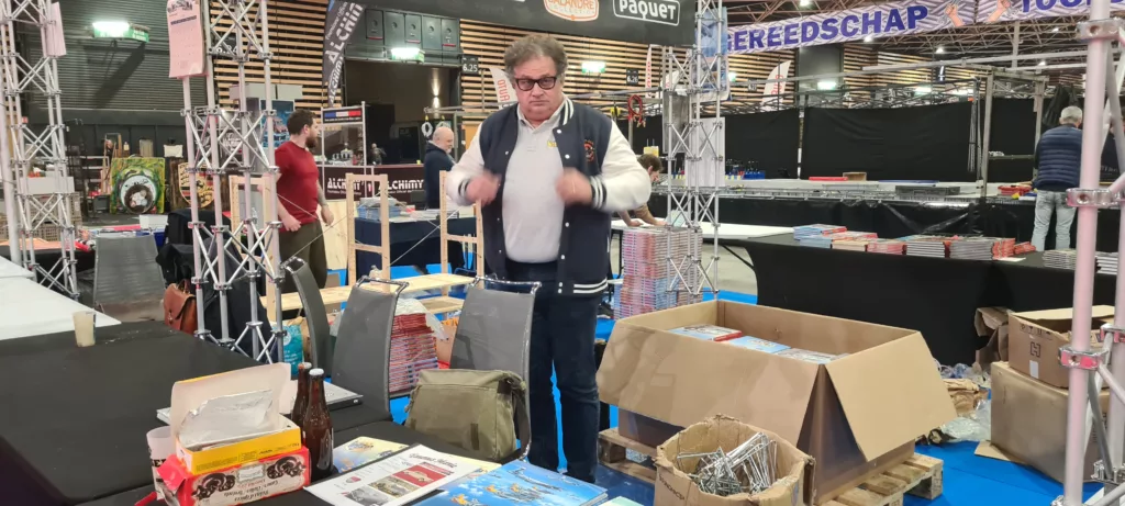 Je parle des voitures, pas des copains ! Quant on voit la tête de Thierry Dubois pliant bagages à la fin du salon, il vaut mieux surveiller ses propos. Ici l’ambiguïté peut faire mal ! Toutefois c’est à lui que je rendrai hommage. Son stand, les éditions Paquet, était proche du nôtre. Pendant trois jours je l’ai vu se plier du bras gauche aux souhaits des nombreux amateurs venus à lui pour une dédicace. Et Thierry dédicace avec un dessin. Trois jours. Presque non stop. On ne peut que saluer. On appréciait déjà l’homme et son travail. Mais son respect pour ses lecteurs nous le rend encore plus sympathique. Bon, ce n’est pas évident sur la photo. Je sais. Comme quoi…