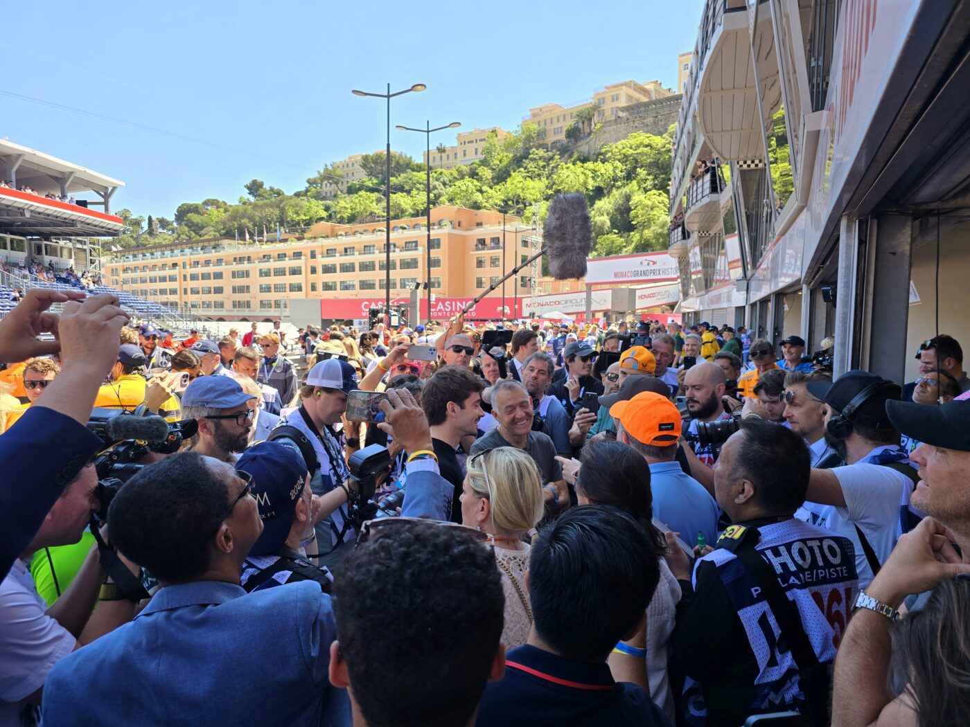 Du côté des stands, la foule, sur la ligne de départ, le Prince et les pilotes de la parade. on a du mal à croire qu’il s’agit du Grand Prix Historique.
