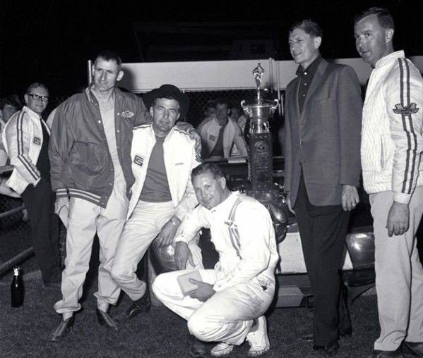 Ken Miles, Carroll Shelby, Lloyd Ruby, Leo Beebe et Roy Geddes (de gauche à droite) célèbrent la première victoire de la GT40 à l’issue de la course de Daytona 2000. (source : auslot.com)