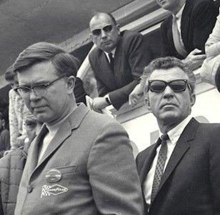 Donald Frey (vu ici en 1967 au Mans avec Carroll Shelby. Source : nitromag.fr) et Roy Lunn (vu ici en 1964, à la présentation de la première GT40. Source : gt40.rkmotorscharlotte.com). Le dirigeant et l’ingénieur concepteur furent deux protagonistes essentiels du défi Ford au Mans.