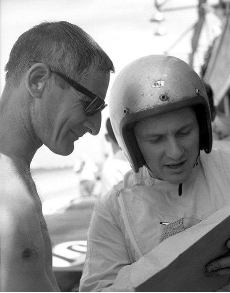 Une magnifique photographie de Ken Miles et Bruce McLaren, souvent associés au cours de l’année 1965 (ici à Sebring). Quand Ken Miles ne portait pas sa combinaison de pilote, il portait sa veste de cuir d’aviateur. Et quand il avait chaud, il se mettait torse nu. Il existe d’innombrables photos de Ken Miles torse nu durant des séances d’essai. (source : sportscardigest.com)
