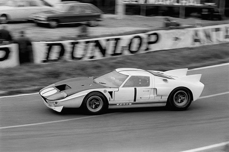 La Ford Mark II de McLaren-Miles aux 24 Heures du Mans 1965. On remarque les deux ailerons longitudinaux installés de toute urgence durant les essais pour stabiliser la voiture. En dépit de ses défauts de mise au point, le niveau de performance intrinsèque de la voiture convainquit l’état-major de Ford qu’il fallait faire le choix stratégique du Ford 7 litres. (source : pinterest.com)