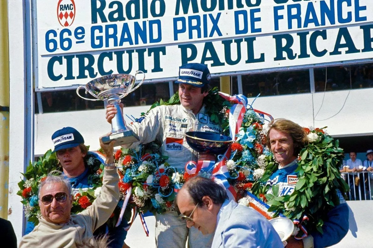 Dès la ligne d’arrivée franchie, Alan Jones s’empara du drapeau britannique que lui tendait le chef mécanicien de chez Williams, Ian Anderson, et promena l’étendard de la perfide Albion sur les 5,8 km du circuit Paul Ricard. Nul doute que sous son casque blanc, l’Australien riait et savourait pleinement ce grand moment de chambrage anti-Balestre. De façon plus prosaïque, Jones reprenait la tête du championnat grâce à cette deuxième victoire après celle de l’Argentine en tout début de saison (et après celle de l’Espagne, mais bon, on n’en reparlera pas). Le sourire continua à illuminer le visage d’Alan sur le podium, flanqué par les deux Français défaits du jour, Pironi et Laffite, jusqu’au moment où on lui amena un cheval sur lequel on l’invita à s’installer. Jones se rembrunit et crut à une nouvelle mauvaise blague de ces maudits froggies, jusqu’à ce qu’on lui explique qu’il avait en fait gagné ce cheval ! Le pilote, qui possédait une immense ferme en Australie, fit donc expédier l’équidé vers les antipodes via Londres et déclara par la suite, toujours dans son autobiographie : « J’estime qu’il [le cheval] a décroché le gros lot… […]… si un Français l’avait gagné, il aurait finalement fini dans une assiette ».