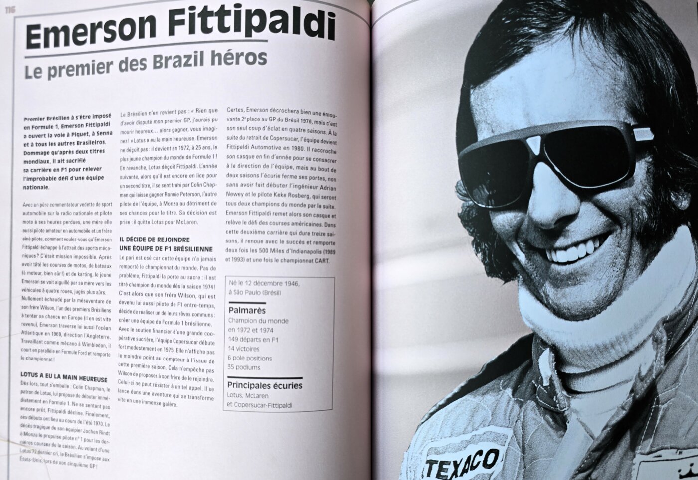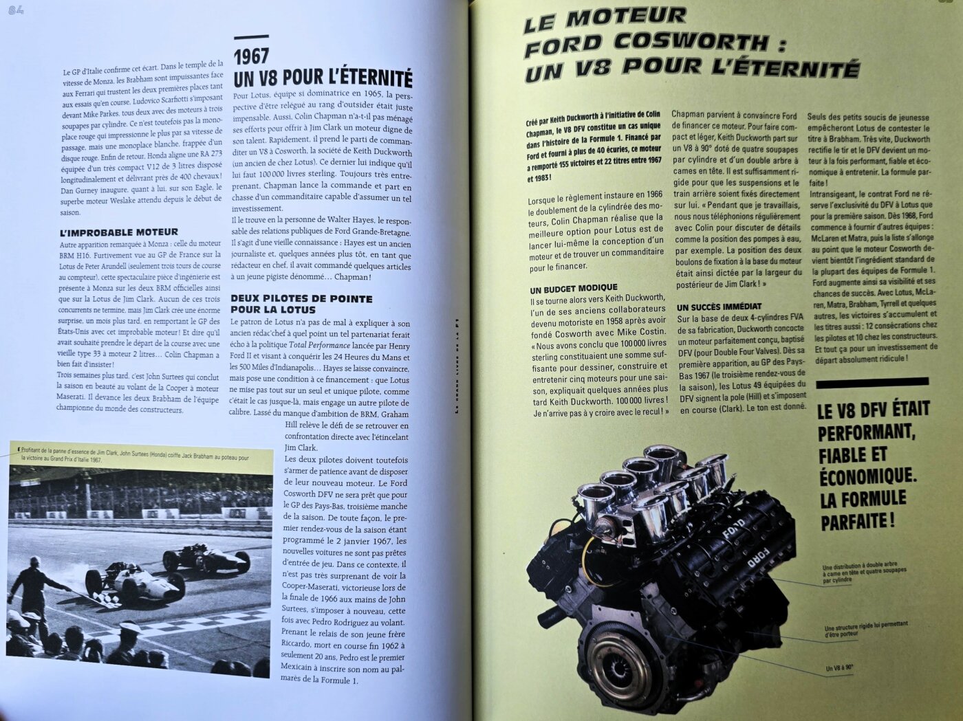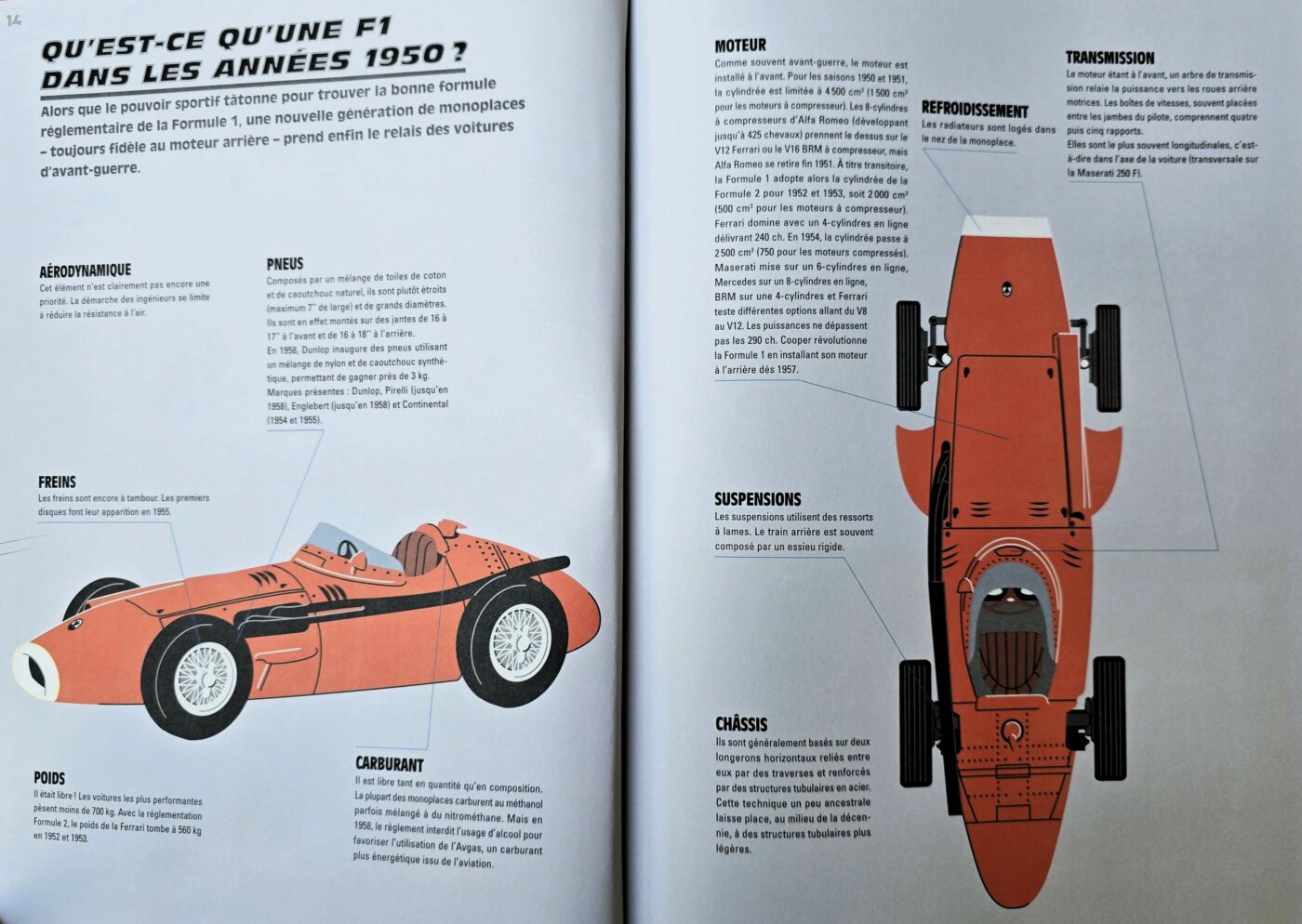 Préfacé par Alain Prost, il se découpe en huit parties couvrant de 1940 à 2023, toute l’histoire de ce qui deviendra la Formule 1 à partir de 1950. Pour chaque période sont mis en avant les pilotes les plus marquants, les évolutions techniques et les courses restées dans les mémoires pour l’âpreté ou l’incertitude des combats menés par nos héros. Le parti pris d’une mise en page claire, de nombreux schémas didactiques et un texte aussi limpide que bien écrit, le tout sur un papier semi-mat, le destine aussi bien à un public averti qu’à un public plus jeune. Aux plus anciens il rappellera peut-être les collections « Tout l’univers » ou « Comment ça marche ? » , de bonnes références assurément. Quant aux plus jeunes cherchant à comprendre l’histoire derrière les intrigues scénarisées de Netflix, ils ont là le cadeau parfait !