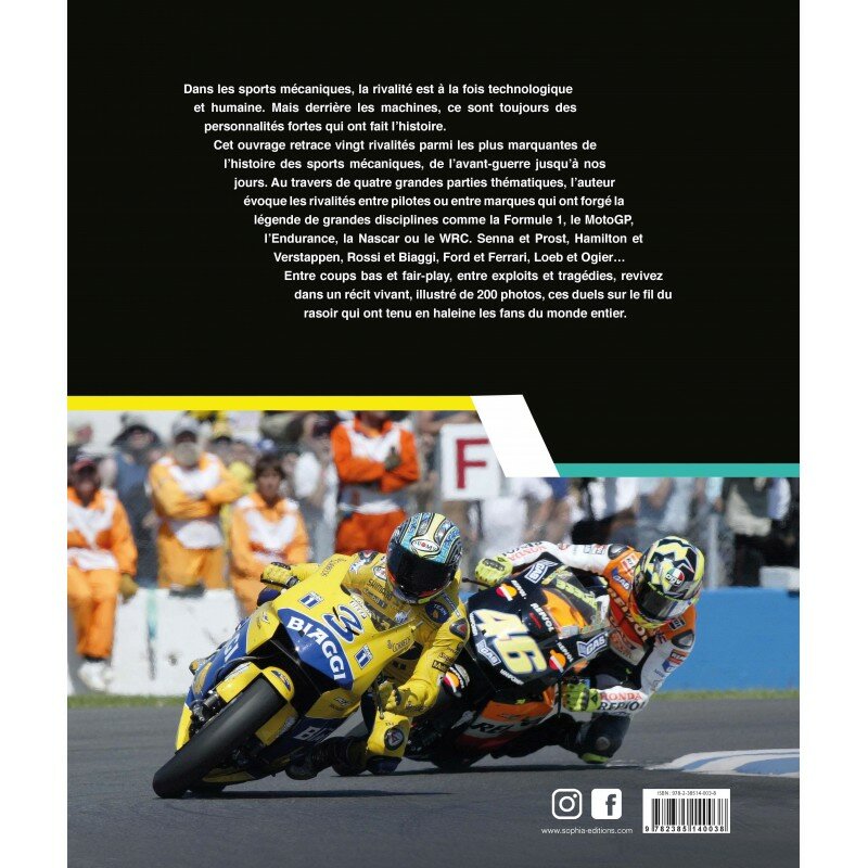 Dans les sports mécaniques, la rivalité est à la fois technologique et humaine. Mais derrière les machines, ce sont toujours des personnalités fortes qui font l’histoire. L’auteur évoque les rivalités entre pilotes ou entre marques : Senna et Prost, Hamilton et Verstappen, Rossi et Biaggi, Ford et Ferrari, Loeb et Ogier… Ces duels ont forgé la légende de grandes disciplines comme la Formule 1, le MotoGP, l’Endurance, la Nascar ou le WRC. Entre coups bas et fair-play, entre exploits et tragédies, un récit vivant, illustré de 200 photos, ces duels sur le fil du rasoir qui ont tenu en haleine les fans du monde entier.