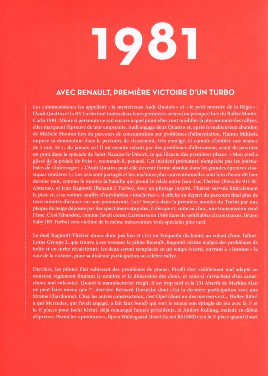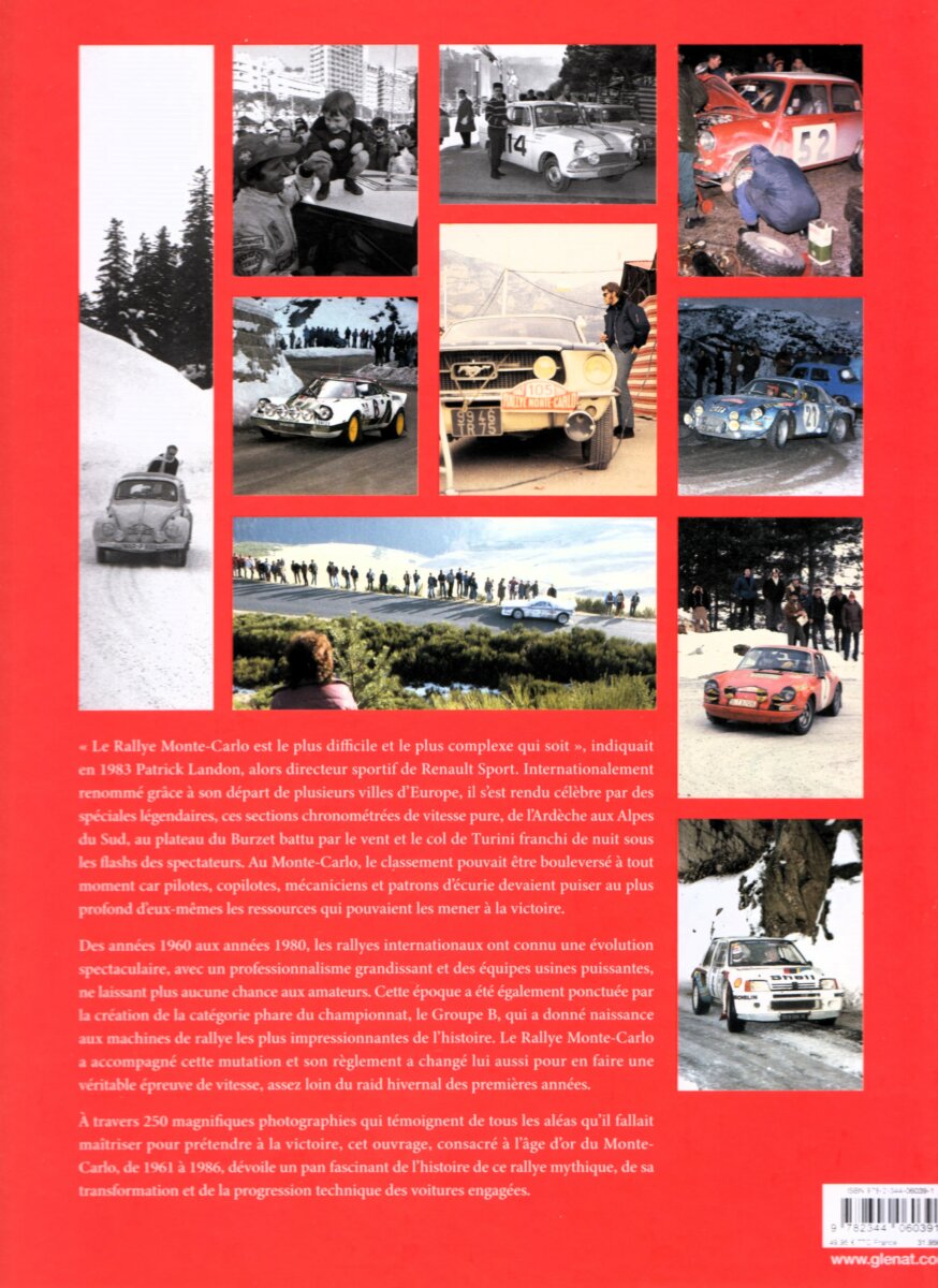 Cet ouvrage, consacré essentiellement à l’âge d’or du Monte-Carlo de 1961 à 1986, dévoile un pan fascinant de l’histoire de ce rallye mythique, sa transformation et de la progression technique des voitures engagées, à travers 250 magnifiques photographies, issues de la photothèque de maurice Louche, qui témoignent de tous les aléas qu’il fallait maîtriser pour remporter la victoire.