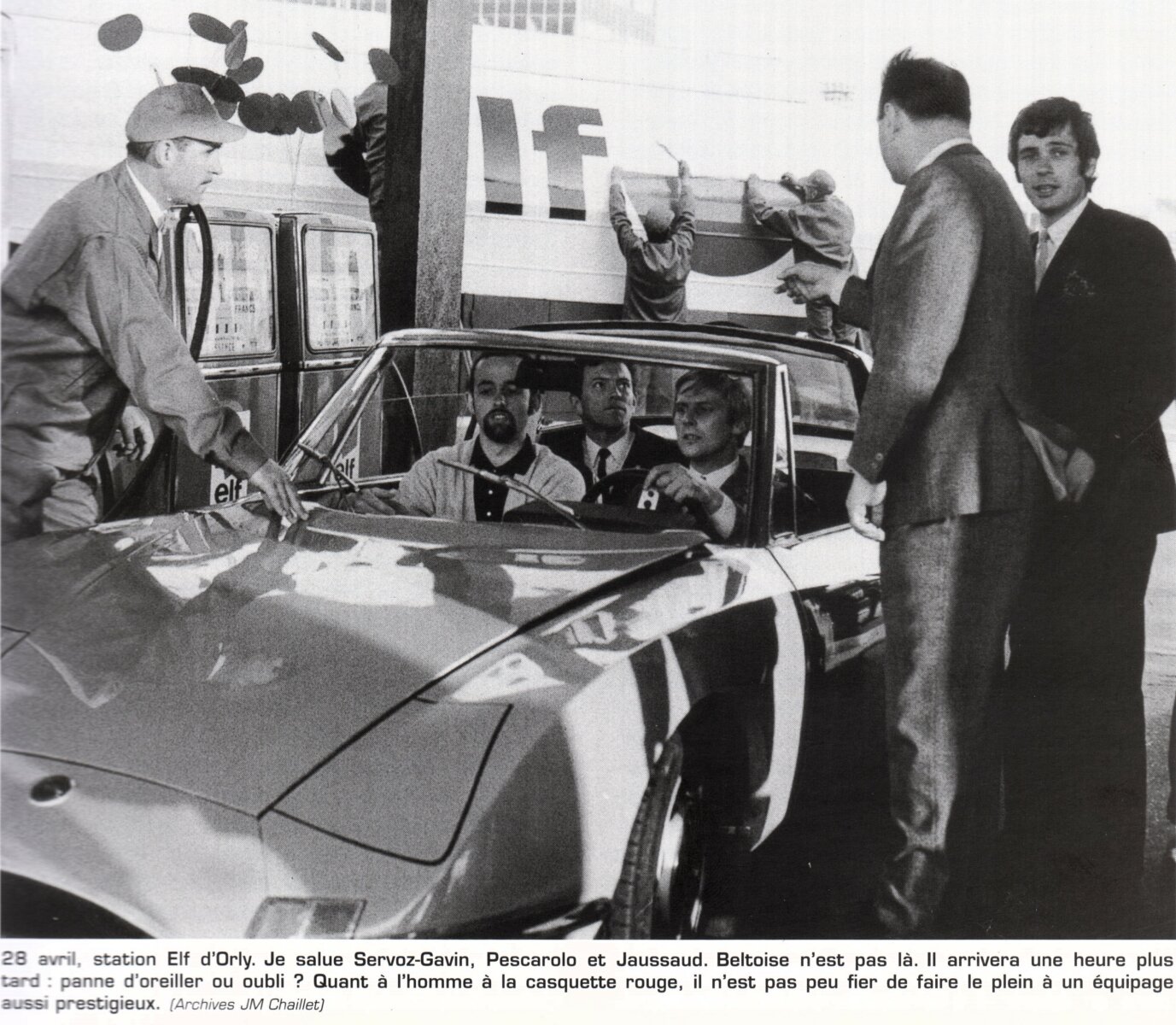 Depuis le début de l’année les quatre pilotes Matra étaient sous contrat avec ce qui allait devenir Elf. Jean-Pierre Beltoise, Jean-Pierre Jaussaud, Henri Pescarolo et Johnny Servoz Gavin. En ce 28 avril 1967 ils avaient rendez-vous avec François Guiter et Jean-Marc Chaillet à la station Elf d’Orly. Le pompiste qui faisait le plein de la Matra 530 de nos pilotes vécut là son heure de gloire.