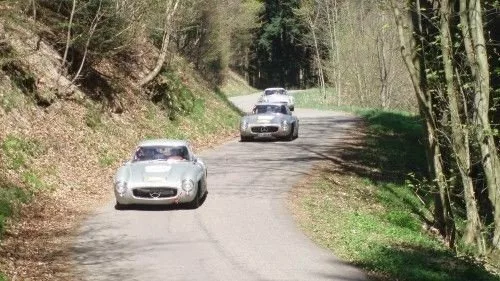 Bientôt 14 h, les passages des BMW sombres s’intensifient, le premier concurrent ne devrait pas tarder. Puis, enfin, un son inhabituel, c’est une anglaise. Pendant le premier quart d’heure, il n’y aura d’ailleurs que des anglaises, MG, Mini Cooper, Jaguar, … Puis arrivent trois gros requins gris à la recherche de quelque proie insouciante. Je me fais tout petit et les trois Mercedes 300 SL défilent devant moi, me laissant une formidable impression de puissance contenue. Je ne peux m’empêcher de lâcher un « Wouah » de plaisir à leur passage, qui restera pour moi l’image forte de cette édition du Tour. Elles sont suivies, au compte-gouttes, par d’autres anglaises et deux ou trois Porsche 356. Puis, plus rien. Un quart d’heure passe, le silence est retombé sur la forêt et n’est plus troublé que par les BMW du Tour et les touristes qui passent et repassent. J’en ai marre d’avoir froid sans compensation visuelle et je repense à ma mésaventure du Tour 1997, quelque part dans le Sud-Ouest : des heures à attendre les concurrents qui, hormis une 250 GT châssis long, ne sont jamais passés pour cause de retard et d’itinéraire modifié en conséquence. Serait-ce un remake ? j’en suis là de mes interrogations quand repasse devant moi le quatuor Type E-911 qui redescend dans la plaine. Ce qui achève de me convaincre de décamper et de me replier sur le plan B : je vais me diriger vers l’Anneau du Rhin. Je n’y serai plus tout seul, mais au moins j’y réchaufferai mes abattis et y verrai certainement les autres concurrents auxquels on aura épargné la route forestière.
