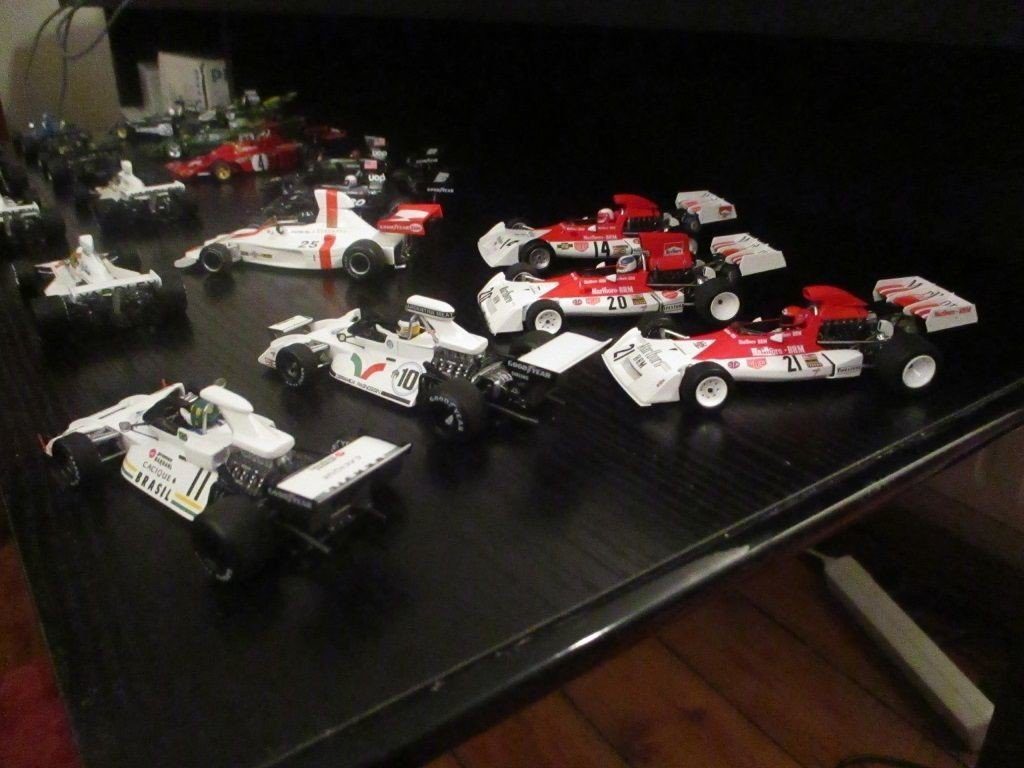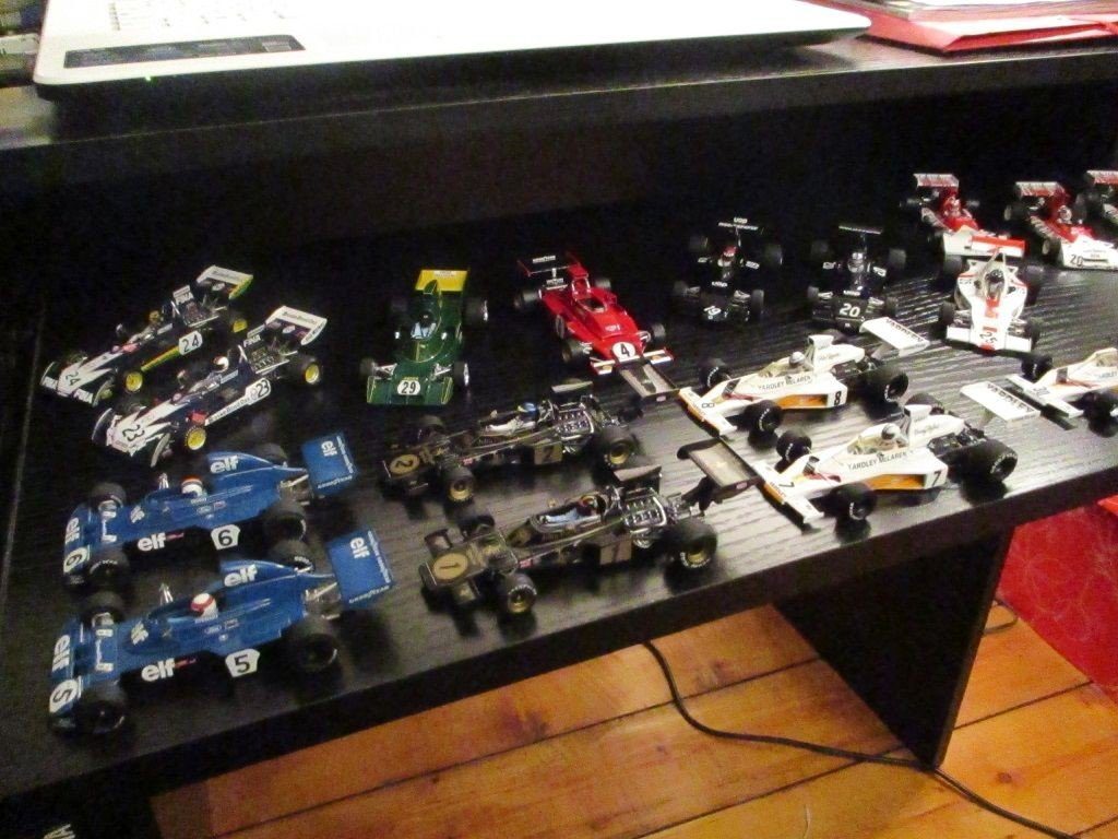 F1 1973. Certains ici le savent, je suis un collectionneur modéliste depuis près de 40 ans. A l’origine spécialisé dans les sport-protos et GT, je me suis diversifié ensuite, sans doute trop. C’est ainsi que j’ai aussi rassemblé des F1 en me limitant néanmoins à la période 1970-75. Mais le champ était encore trop large et je l’ai donc réduit à une seule année : je ne collectionne plus que les F1 de la saison 1973. Le but est donc de reproduire une grille de départ-type de cette année-là au 1/43. Comme on peut le voir ci-dessous, l’affaire est bien avancée.