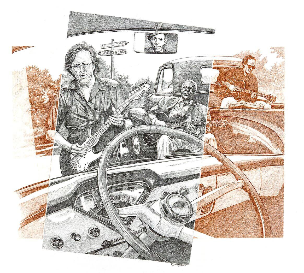 « Crossroads » est un morceau composé par Robert Johnson musicien Afro-américain considéré comme un des fondateurs du Blues . Éric Clapton va reprendre ce morceau en l’électrifiant avec le groupe Cream. Ce morceau sera également interprété par de nombreux musiciens. Clapton va aussi enregistrer des albums avec d’autres musiciens et amis qu’il admire : BB King et JJ Cale . Il va même organiser un festival où il invite tous les plus grands guitaristes afin de lever des fonds pour financer un centre de désintoxication qui porte le même nom : Crossroads. Le dessin représente cette croisée des chemins qui rassemble Clapton, BB King, JJ Cale et bien sur Robert Johnson avec qui toute cette histoire a commencé. »