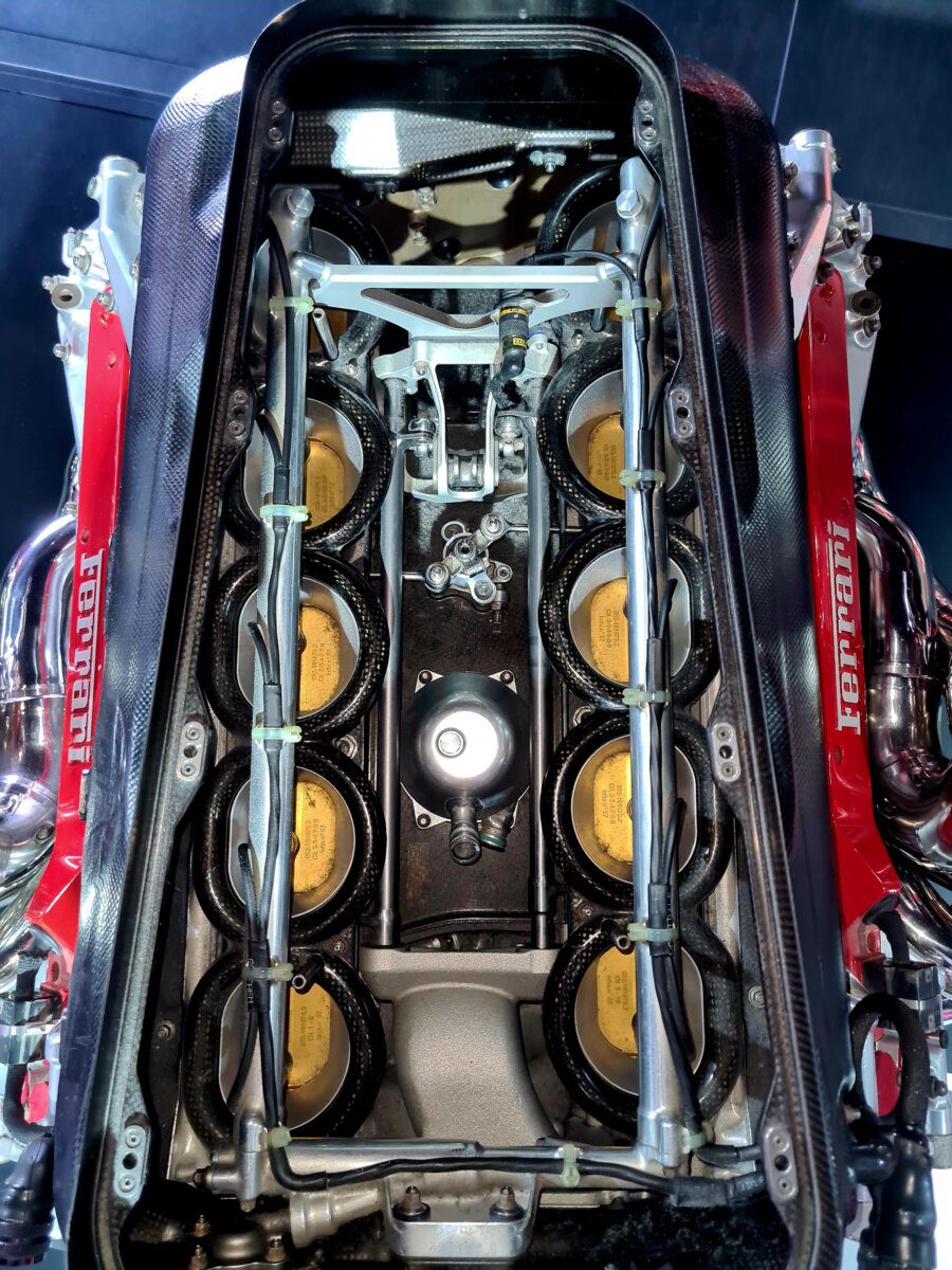 La salle des trophées est belle. Les pilotes champions du monde avec Ferrari sont mis à l’honneur : Ascari (2), Fangio, Hawthorn, Hill, Surtees, Lauda (2), Scheckter, Schumacher (5), Raikkonen. Ca semble peu en 72 ans. Mais aucune marque n’a autant brillé. Neuf pilotes qui cumulent quatorze titres. Sans oublier les seize titres constructeurs, toujours inégalés. ( Williams arrive en 2e avec neuf titres). Les F1 présentées sont celles de Schumacher, Raikkonen et Villeneuve. Aucun nom ne figure sur les carrosseries. Sauf celui de Gilles sur la 126 CK… Plus loin on peut admirer la F1 2021 aux couleurs de 2022 et rester songeur, comme je le suis à chaque fois, devant la longueur de ces F1, proche de 5.80 m.