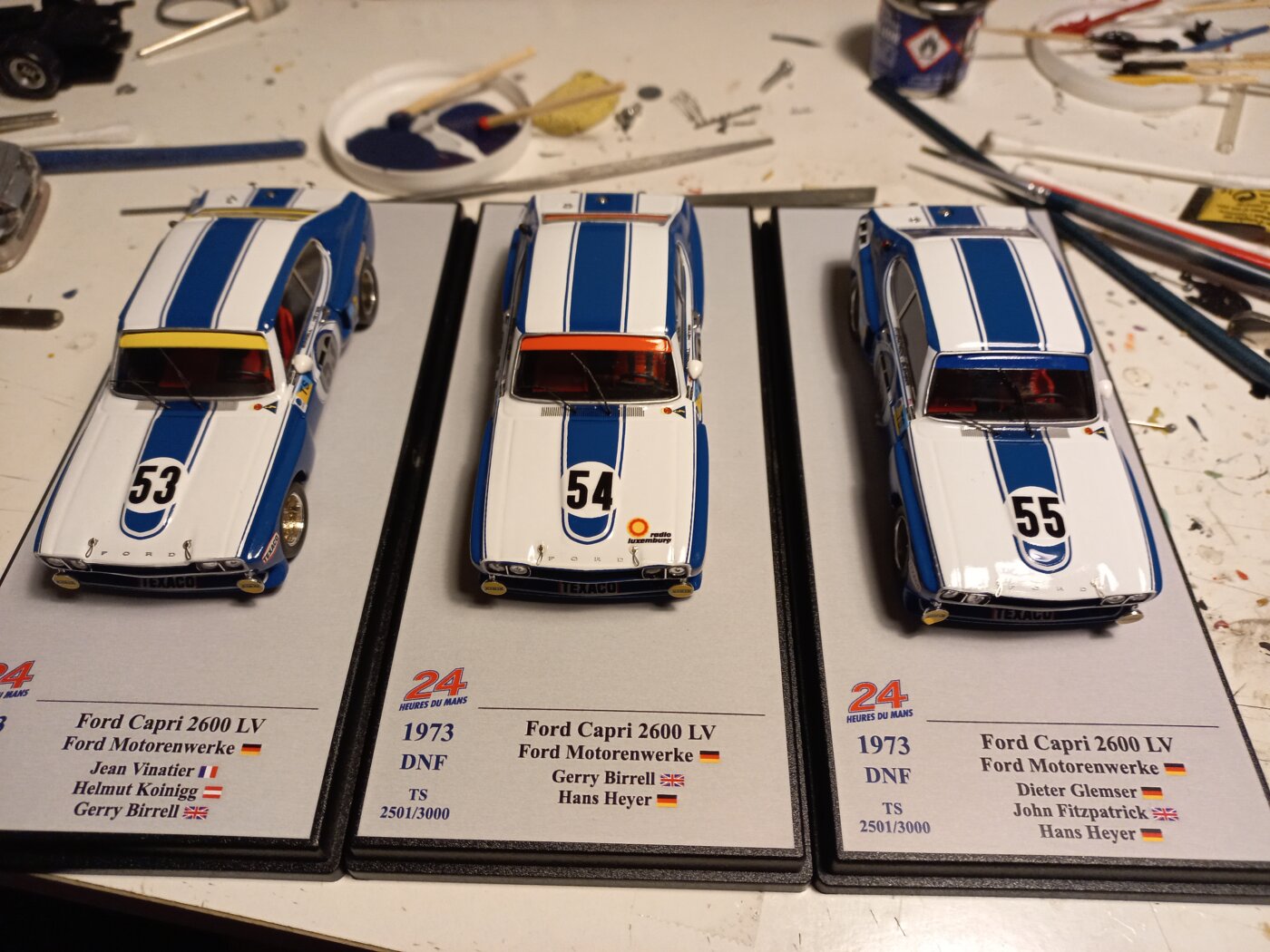 Voilà pour le rappel historique des vraies. Quant aux miniatures, cela fait déjà une vingtaine d’années que le fabricant portugais Trofeu a sorti ses premières Ford Capri 2600 RS, dans leur livrée usine des 24 Heures du Mans 1972. Depuis, quelque 50 versions de ce modèle très réussi sont apparues au fil des ans. Mais toutes n’avaient pas un grand intérêt, loin s’en faut. Et nombre de collectionneurs se demandaient quand Trofeu allait enfin se décider à s’intéresser aux versions de 1973. Votre serviteur au premier chef puisqu’il s’est mis en tête il y a longtemps de rassembler la totalité de la grille des 24 Heures du Mans 73. Certes, ces Capri ont été reproduites en kit il y a déjà longtemps, mais je ne me voyais pas peindre et monter trois modèles quasiment identiques au numéro près.