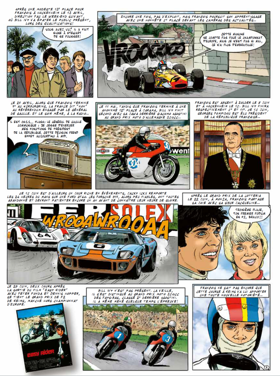 L’album sur Cevert, et c’est là son astuce, n’est pas fait que de dessins. Il contient 44 pages de BD, et 20 pages de reportages passionnants menés sur les traces du pilote : témoignages de pilotes de l’époque, biographies d’ingénieurs, portraits de mécaniciens, entretiens avec des journalistes, anecdotes familiales, allusions aux chanteurs et au cinéma de l’époque.