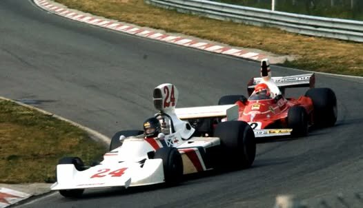 Débarrassé d’un Jarier hyper vite mais victime d’une crevaison, Niki Lauda, qui a changé ses pneus très tard – prudence de boutiquier -, se rapproche de la Hesketh.