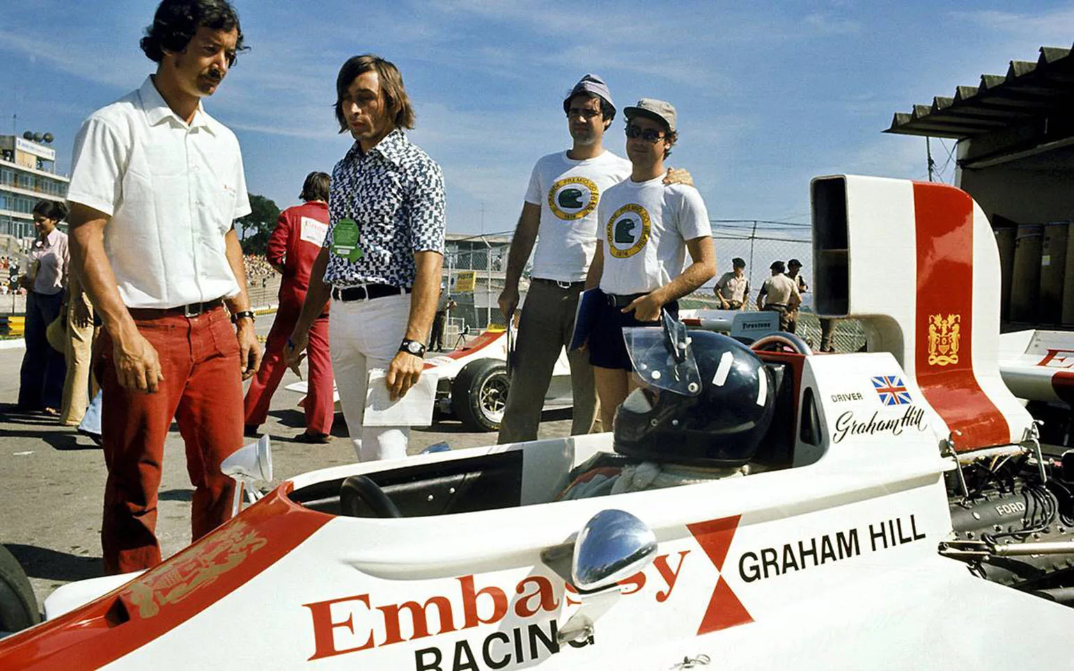 Le samedi 19 juillet 1975, quelques heures avant le départ du Grand Prix de Grande-Bretagne, eut lieu une bien émouvante cérémonie sur le circuit de Silverstone : en tenue de ville, cheveux au vent, le grand Graham Hill s’offrit un tour de piste sur la GH1 Embassy-Hill de son écurie, pour saluer une dernière fois la foule extatique consciente de vivre là un moment exceptionnel. Quelques semaines plus tôt sur le circuit de Monaco qui lui avait tant réussi par le passé, le célèbre moustachu avait subi l’affront d’une non-qualification. Hill, qu’on pouvait parfois qualifier de « têtu », avait instantanément compris le message : place aux jeunes, les vieux derrière le muret pour diriger l’équipe. Sa femme Bette et ses enfants, Brigitte, Damon et Samantha avaient alors soupiré de soulagement.