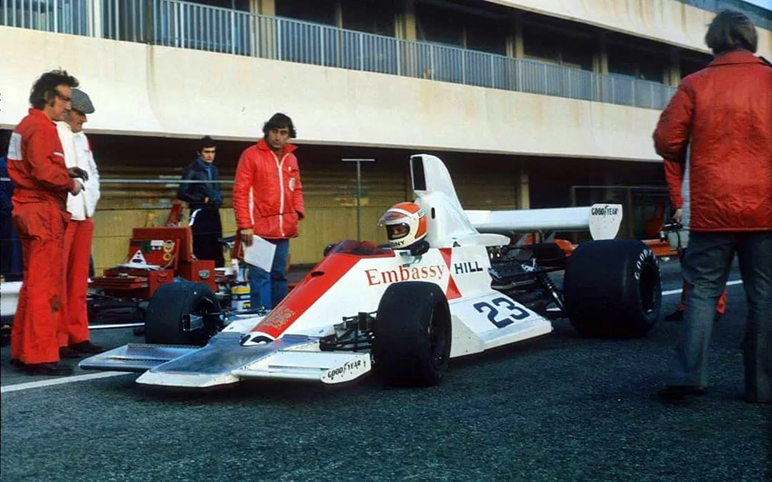 Il avait fondé son écurie en 1973, d’abord en pilotant une Shadow aux couleurs du cigarettier Embassy, puis en faisant construire chez Lola un châssis neuf qu’il appellerait Hill en 1975 suite à un accord avec Eric Broadley. La première mouture, la GH1, était lourde et manquait d’adhérence, la deuxième, dessinée par Andy Smallman et prévue pour 1976, devait remédier à ces deux problèmes principaux. L’une des deux monoplaces blanc et rouge était alternativement pilotée par le spécialiste de l’endurance Rolf Stommelen, et l’Australien bourru Alan Jones. L’autre fut confiée en cours d’année 1975 à un espoir anglais, Tony Brise, qui ramena le premier point au patron dès son deuxième grand prix, en Suède. Dès lors, les aléas de la mécanique privèrent le jeune homme de performances promises, mais avec une bonne voiture, toutes les attentes étaient permises.