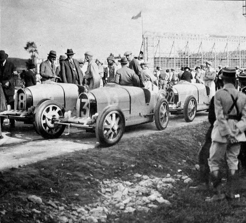 L’ordonnancement des couleurs est bien sûr d’actualité, bleu pour la France, rouge pour l’Italie, blanc pour les USA, vert pour l’Angleterre. Le gris argent est absent, six ans séparent pourtant cette course de la fin des hostilités de 1914-18. Coté français l’équipe Bugatti a amené ses toutes récentes type 35 bichonnées par leurs mécanos et le patron en personne.