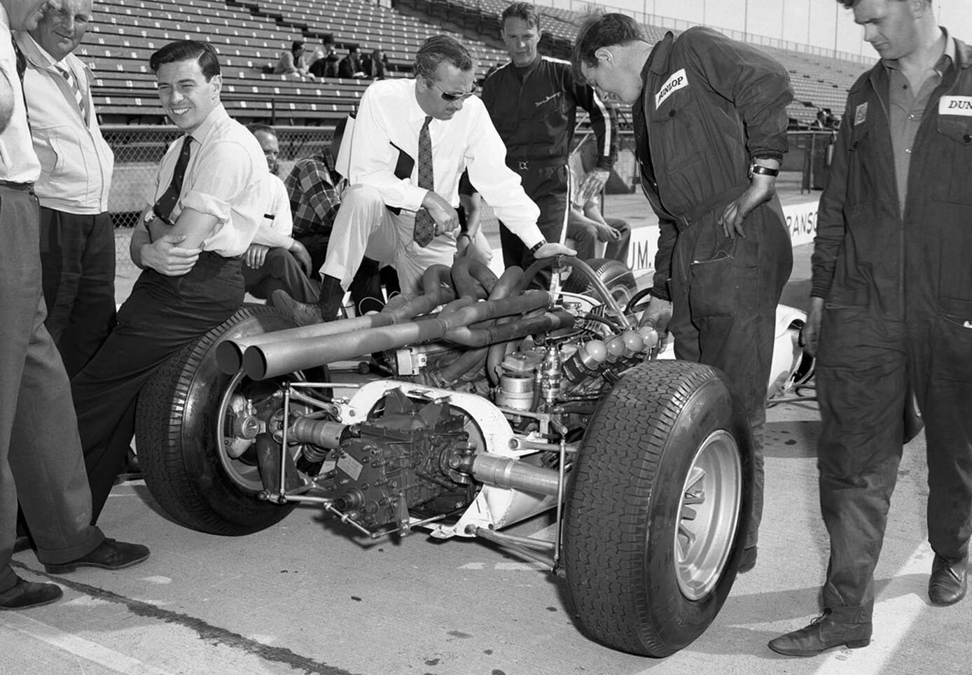 Les adversaires américains des Lotus roulaient « patriotes », à savoir Goodyear et Firestone. Imaginant faire la différence avec ces produits qu’il jugeait peu évolués, Chapman demanda à Dunlop de lui concevoir des gommes plus tendres, donc plus adhérentes. Chaussé de la sorte, Jim Clark établit la pole position, mais Dan Gurney explosa les siennes. Le pilotage de Dan, plus musclé que celui, fluide, de Jim, fut-il la cause de cet état de fait ? Toujours est-il que Colin demanda à son fournisseur de revoir sa copie dans le sens de plus de dureté et de lui envoyer les nouveaux trains par avion pour le jour de la course.