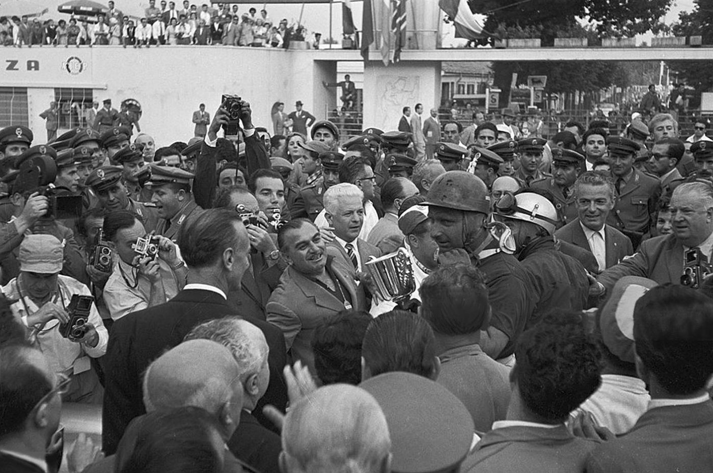Dans la série « chaque image raconte une histoire », nous en avons une bien belle à narrer en voyant cette photo tellement parlante. Nous sommes à Monza en 1953, au terme d’un Grand Prix d’Italie haletant. Une foule enfiévrée comme seule la péninsule transalpine peut en produire se masse autour du vainqueur du jour : Juan Manuel Fangio a enfin vaincu le mauvais sort qui l’accablait depuis deux ans. Ce qu’il ignore encore, c’est qu’un personnage providentiel va lui ouvrir les portes du triomphe. Alfred Neubauer est juste derrière lui, mais il ne le voit pas.