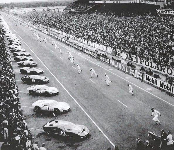 Que le meilleur perde ! Le résultat des 24 heures du Mans 1966 s’est joué dès le départ. L’équipage Miles-Hulme (numéro 1), plus performant aux essais, est positionné deux places devant l’équipage McLaren-Amon (numéro 2). Douze mètres les séparent, qui seront décomptés à l’arrivée (source : Art Evans, Ken Miles).