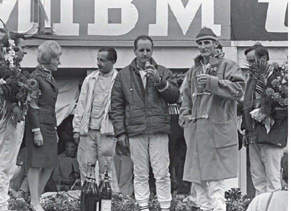 Le champagne est amer pour Denny Hulme et Ken Miles, et leur visage en dit long sur l’étendue de leur déception. A gauche, Bruce McLaren a l’air désolé, tandis que Chris Amon, à droite, semble s’excuser. Madame Henry Ford II discute avec l’anglais Colin Davis qui a remporté la catégorie 2 Litres sur une Porsche 906, avec son coéquipier Siffert. Déjà vu aux 24 Heures de Daytona (voir plus haut) on remarque à nouveau le « duffle coat » de Miles, toujours aussi averse à toute forme d’élégance vestimentaire (source : blog.quartoknows.com).