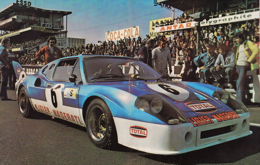 Ligier devient l’écurie officielle de Citroën en 1974. La JS2 fut habillée d’une robe bleue et blanche, couleurs qui étaient les couleurs du pétrolier Total. Nouvelle silhouette également avec des parements aérodynamiques plus évolués surtout au niveau de l’aileron arrière liée à l’apparition d’une prise d’air sur le toit. Sous la lunette à persiennes, le V6 Maserati grimpa dans sa version la plus évoluée à 380 ch permettant plus de 300 km/h au Mans. Mais cette fois, c’est la boîte de vitesses de la SM qui avait du mal à encaisser la puissance et dut céder sa place à une transmission à crabots. De nombreux abandons dus à des ennuis techniques émaillèrent le cours de la saison sanctionnée par une double victoire au Tour de France auto avec Larrousse suivi de Darniche.