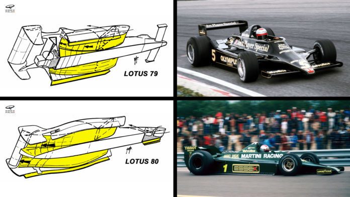 En vue de la saison 1979 Colin Chapman entendait faire encore progresser son concept. Il se focalisa sur la future Lotus 80. Elle devait disposer d’un effet de sol suffisant pour lui éviter l’usage d’ailerons. A l’avant comme à l’arrière.