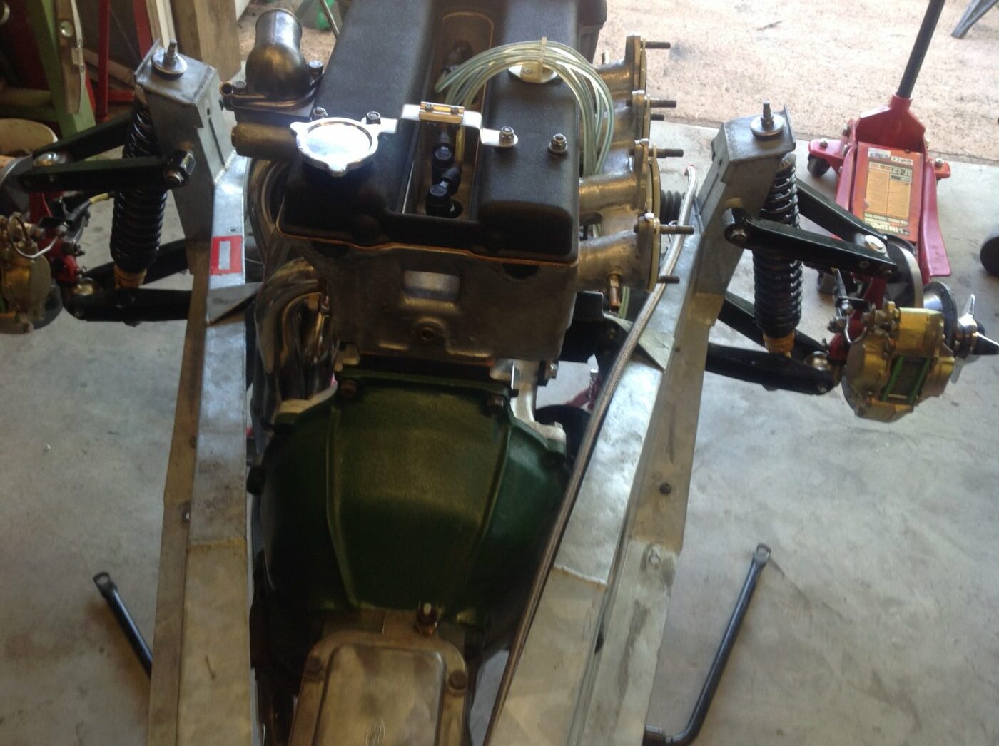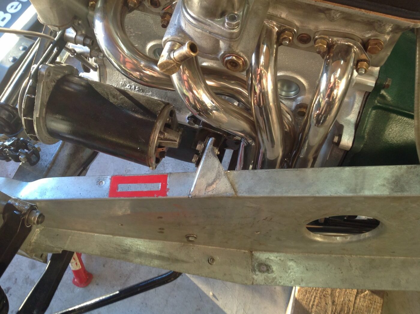 Observation curieuse, la culasse Twin Cam étant posée sur un bloc Ford classique, l’arbre à came de celui – ci, dans le bloc, a été conservé pour entrainer l’allumeur et la pompe à huile. De là à parler de Tri Cam …