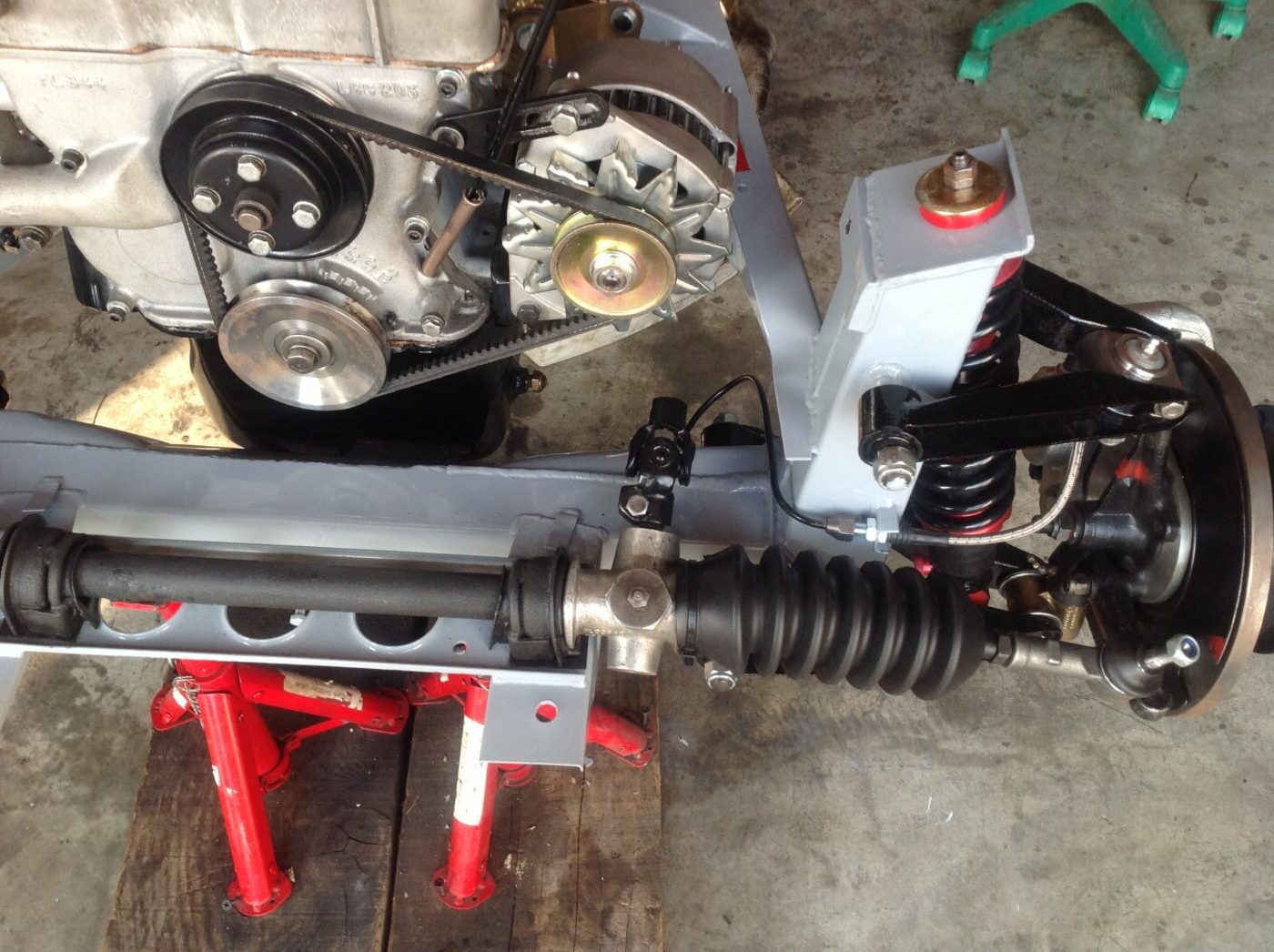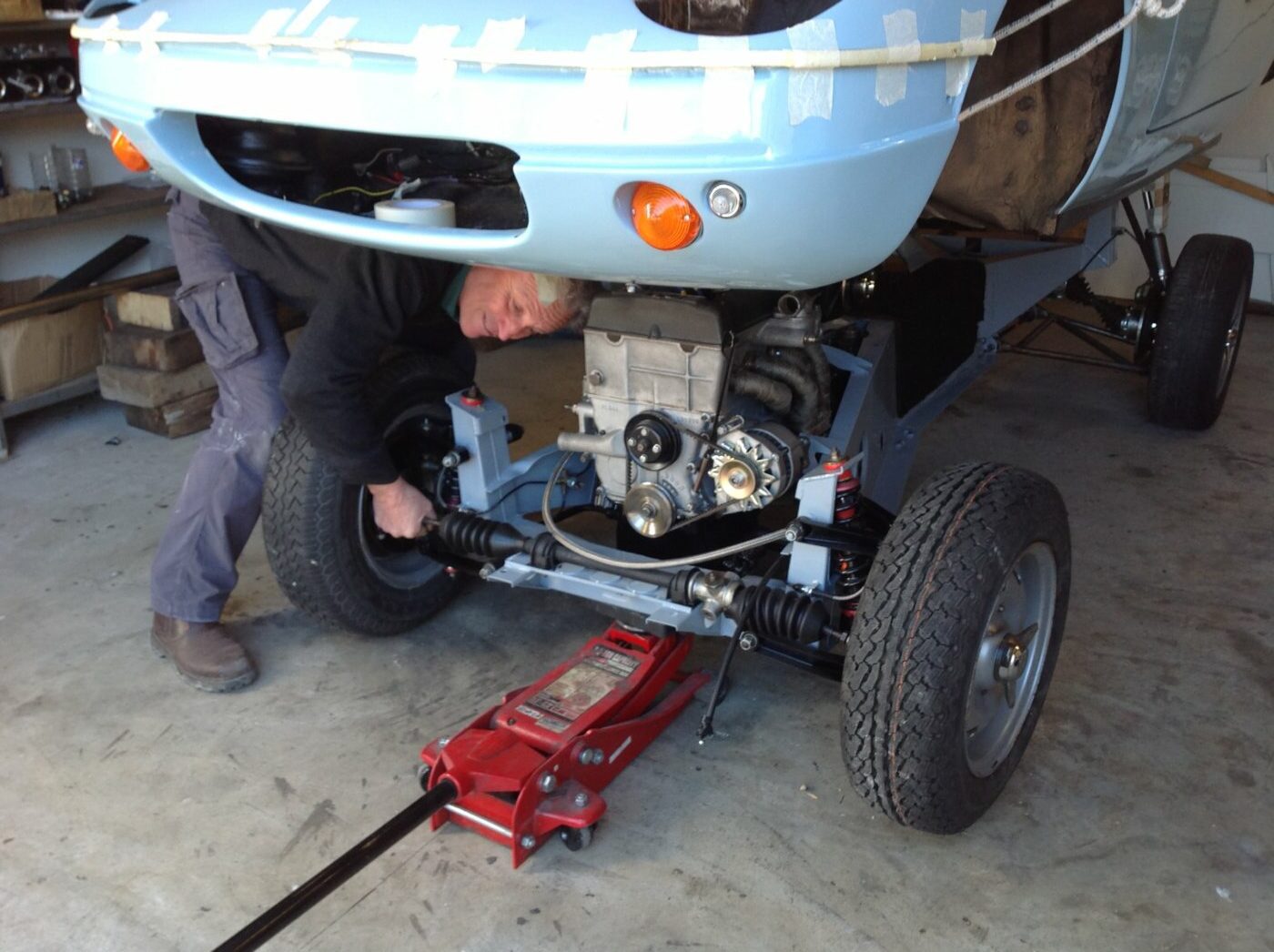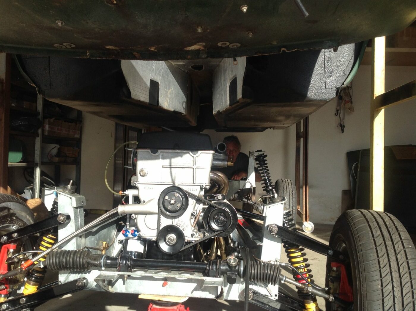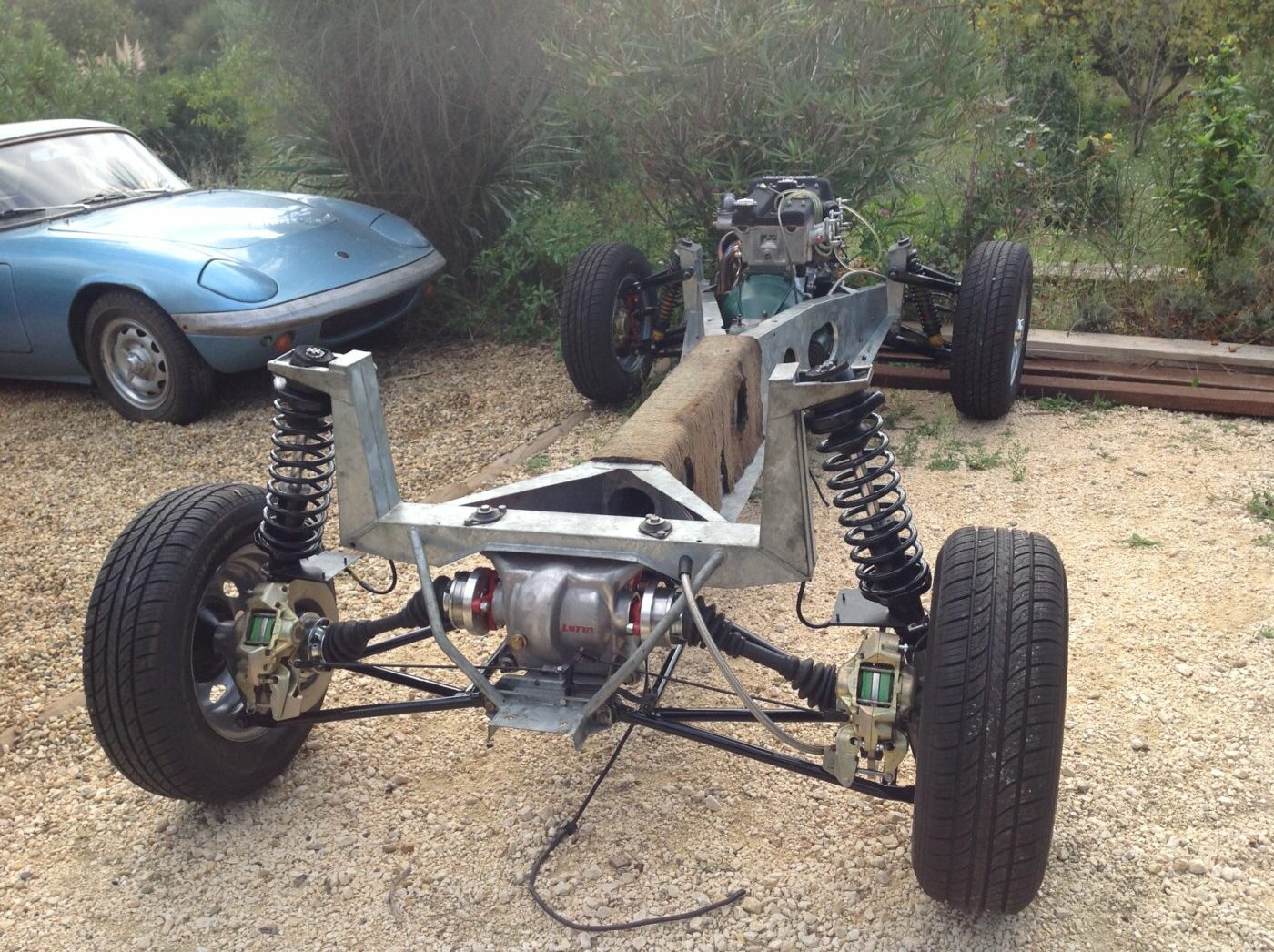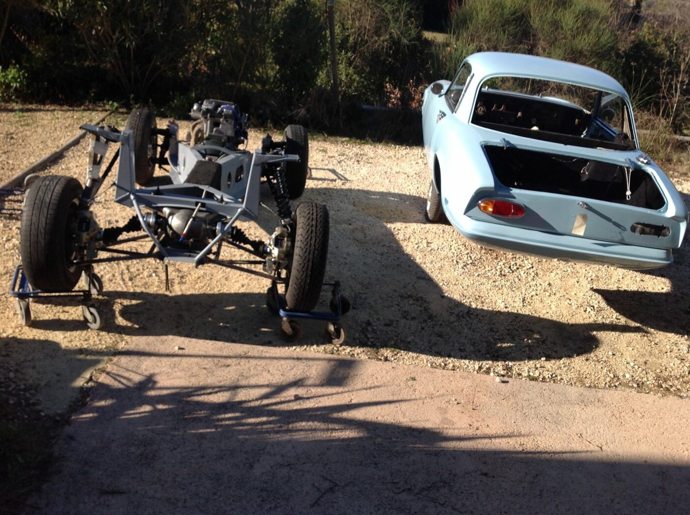 La technique des deux autos est la même : châssis poutre, carrosserie en fibres de verre rapportée. Le démontage se fait donc en ôtant la carrosserie du châssis puis en retirant toutes les pièces de châssis : moteur, boîte, pont, suspensions.