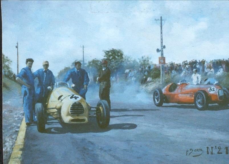 C’est avec ces principes de base bien en tête que je vis un peu plus tard, à côté de mes parents sur la pelouse des spectateurs située à l’intérieur de l’épingle du Faye, les monoplaces bleues, vertes, rouges et jaunes passer roue dans roue devant nous, dans un hululement inouï d’échappements libres. Les Ferrari et les Gordini étaient particulièrement en pointe dans cette bagarre, qui incluait aussi des Maserati et des HWM, et se tiraient une bourre phénoménale. Un vieux coureur italien, Piero Taruffi, sortait du lot après que deux Français, Robert Manzon et Jean Behra sur Gordini, lui eurent donné bien du fil à retordre.