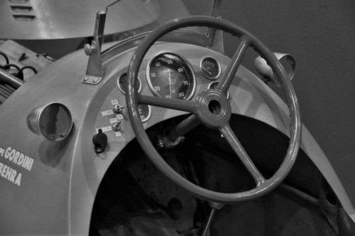 Quand, après avoir garé la Bugatti sur la grande pelouse extérieure à l’autodrome, mon père nous a amenés sous le virage relevé qui servait de parc des coureurs, alors là mes amis, c’est tout un monde qui s’est offert à mes yeux émerveillés. Les autos, leurs formes, leurs couleurs, l’odeur de ricin, les compte-tours, les pneus sculptés aux marques exotiques (Pirelli ou Englebert), il y avait tout à découvrir. En me hissant sur la pointe des pieds pour examiner de près le cockpit de ces autos qu’on eût dit venues d’une autre planète, j’ai aperçu que le fond était muni de larges cornières en aluminium, servant de repose-pieds pour les pilotes. De harnais de sécurité, à l’époque, pas l’ombre d’un. Un siège-baquet, un large volant à la jante en bois et aux branches en acier chromé, ou alors en « bakélite » pour les Gordini, deux rétroviseurs au carénage arrondi, un long levier de vitesses coudé et sur la planche de bord, un large cadran gradué jusqu’à… 80 si j’ai bonne mémoire.
