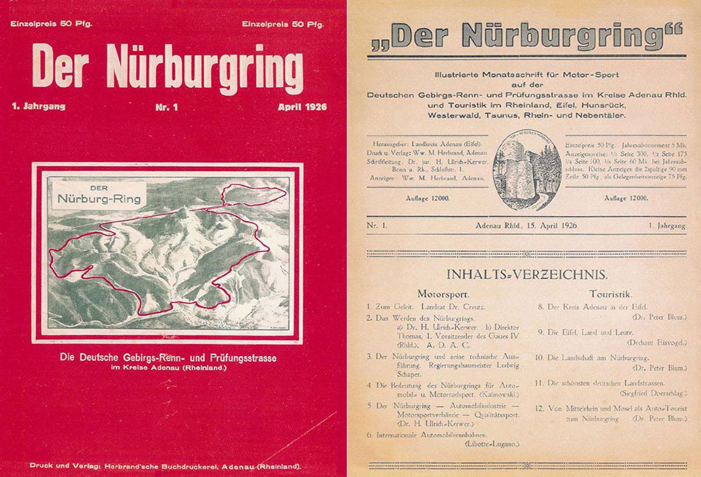 Le projet étant dès lors officiellement démarré, il fallait le faire savoir (on dirait aujourd’hui « faire du buzz »). Jamais à court d’idées, le Dr Creutz lança en avril 1926 une nouvelle publication appelée « Nürburgring – Revue mensuelle illustrée pour le sport à moteur sur le circuit de courses et d’essais du cercle d’Adenau » (ouf !). Était également mentionné à l’intérieur : « Tourisme en Rhénanie, dans l’Eifel, le Hunsrück, le Westwald, le Taunus, le Rhin et les vallées avoisinantes », histoire d’attirer également les touristes plus sensibles aux charmes de la nature qu’à celles des moteurs et carrosseries. Il faut préciser à l’intention de celles et ceux qui ne connaissent pas la région qu’elle est effectivement de toute beauté et propice aux randonnées de toutes sortes.