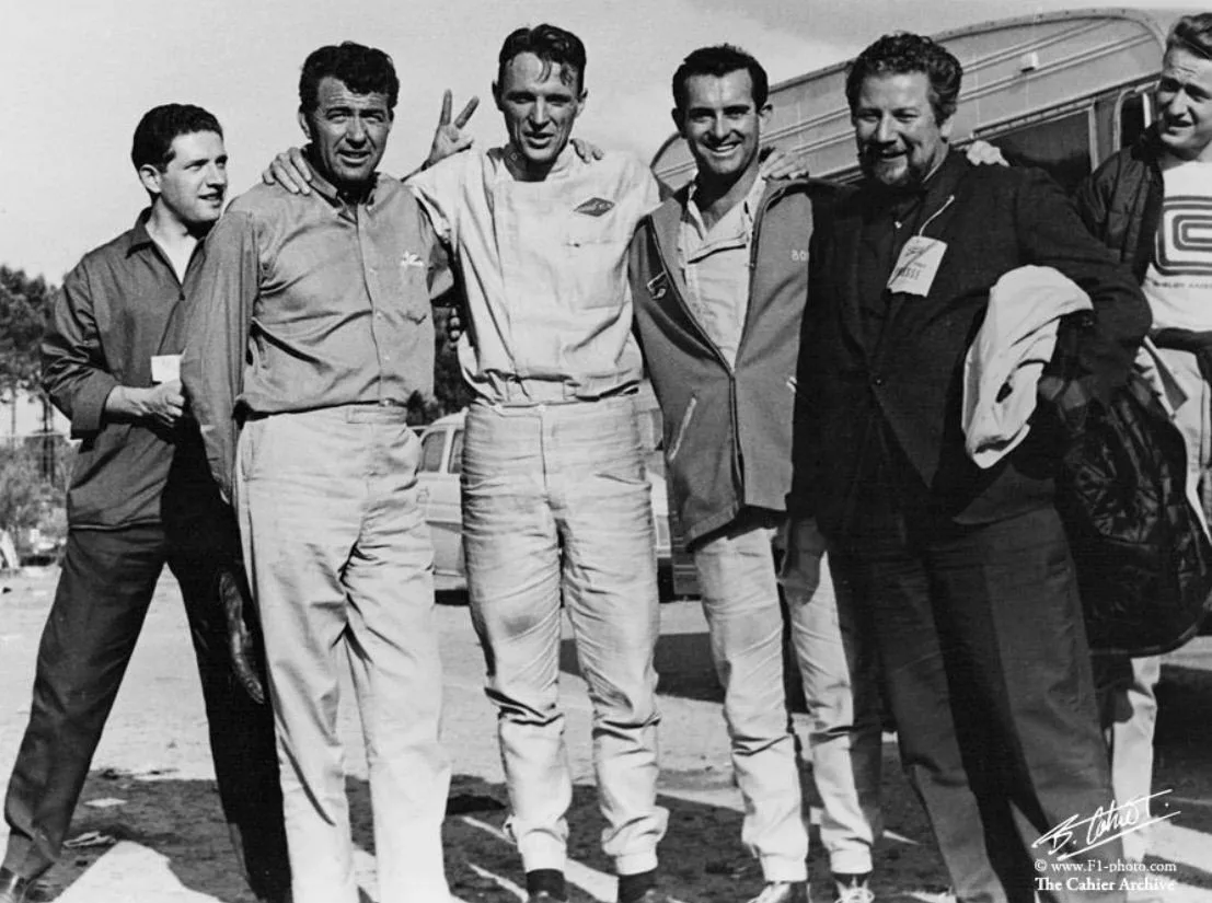 Pascal facétieux au Mans en 1964, près de la caravane Goodyear (saurez-vous reconnaître ses 5 compagnons ?) – © The Cahier Archive