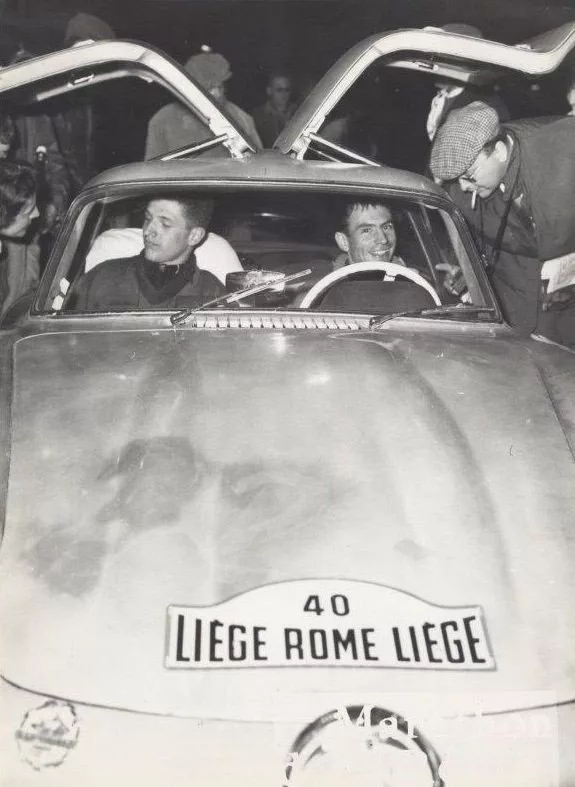 J’ai commencé à conduire en allant faire de l’avion. Trois ans plus tard je conduisais régulièrement, en allant porter le soir les articles de mon père à l’imprimerie, pour le lendemain. Y compris lorsqu’il y avait une Porsche Carrera 1500 en essai, à la maison. J’ai commencé assez vite à rouler avec une Lancia Aurelia Spider America que mon père avait achetée au début de 1955 et j’avais fait des temps sur des étapes spéciales des 12 Heures de Huy. C’était une épreuve qui partait le soir et arrivait le matin, on était seul à bord. Il y avait des étapes spéciales qui étaient absolument phénoménales, par exemple les Poudreries de Clermont. Les principales se déroulaient sur les contreforts de la Meuse, avec des pentes très fortes, comme dans la Flèche Wallonne ou Liège-Bastogne-Liège. Willy avait appris les temps que j’avais faits par mon père. Génin, son coéquipier avec qui il avait gagné le Liège-Rome-Liège l’année précédente, était tombé malade et il m’a donc invité à l’accompagner. C’était un cadeau gigantesque dont sans doute je n’ai pas pu profiter complètement car j’étais alors à l’armée ; j’étais candidat officier dans un régiment de cavalerie et j’avais obtenu de mon chef de corps, le Colonel François Carton de Wiart, la permission de participer à cette épreuve. Cavalerie, cavalerie blindée, … la course lui parlait et il aurait bien aimé que nous gagnions ! Il ne voyait pas pourquoi nous n’aurions pas gagné puisque l’année précédente Mairesse avait gagné ! Mais … j’étais un peu jeune, donc pas tellement endurant comme on peut l’être à 40 ans, comme un Robert Buchet par exemple, ou comme Lucien Bianchi qui pouvait rouler 3 jours d’affilée sans s’émouvoir. Nous n’avions pas beaucoup de notes et en plus c’étaient des notes manuscrites. Très honnêtement, je ne parvenais pas à lire correctement ces notes que je n’avais jamais vues, avec l’éclairage de fortune qui existait à bord de cette 300 SL, qui était luxueuse mais qui n’avait rien de spécialement préparé pour un rallye international.