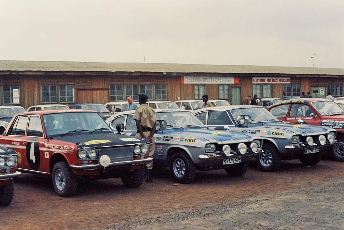 Safari 1970 : pointé en tête avec sa Capri (à droite sur la photo), Aaltonen devra laisser la victoire aux locaux Herrmann-Schuller et leur Datsun n°4 – © DR