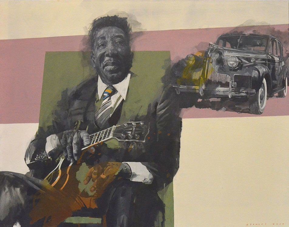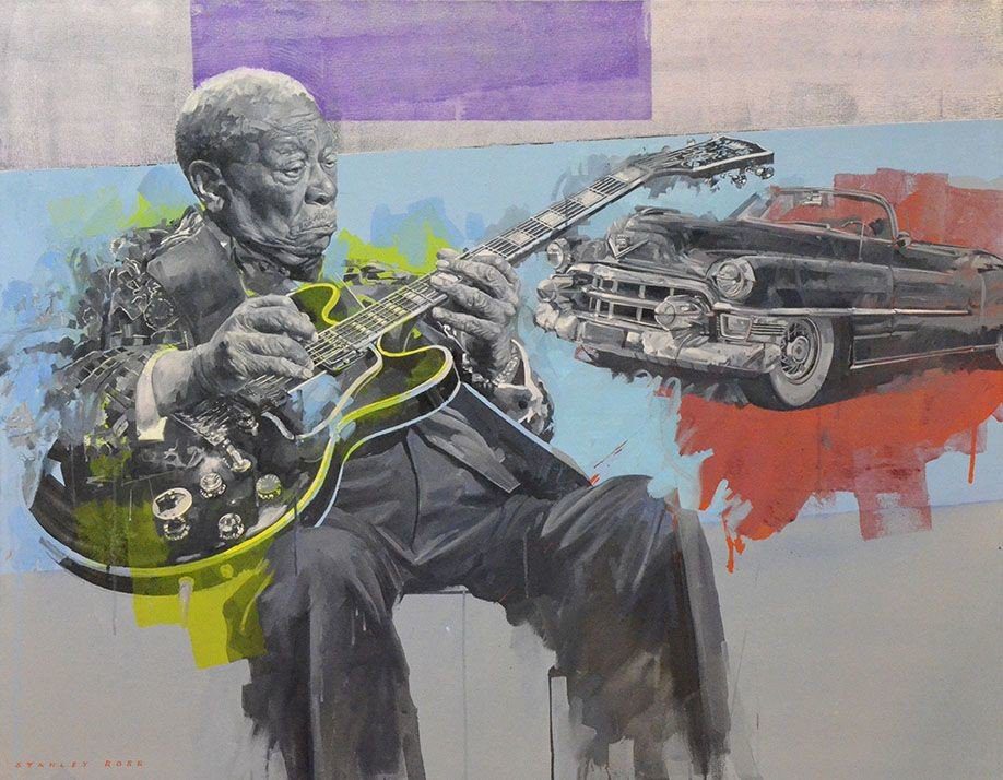 « J’adore la forme de cette guitare, elle est d’une harmonie extraordinaire. Et elle va bien avec l’ambiance années cinquante que je voulais rendre dans ces toiles. J’avais déjà peints deux toiles en hommage à BB King, juste après sa mort, que j’ai vendu aussitôt à Pebble Beach en août dernier. Du coup pour Rétromobile, je me suis dit qu’associer des voitures mythiques à ces grands noms du blues serait peut-être une bonne idée. Nous avons la Cadillac pour BB King, la Buick pour Muddy Waters et la Road Master