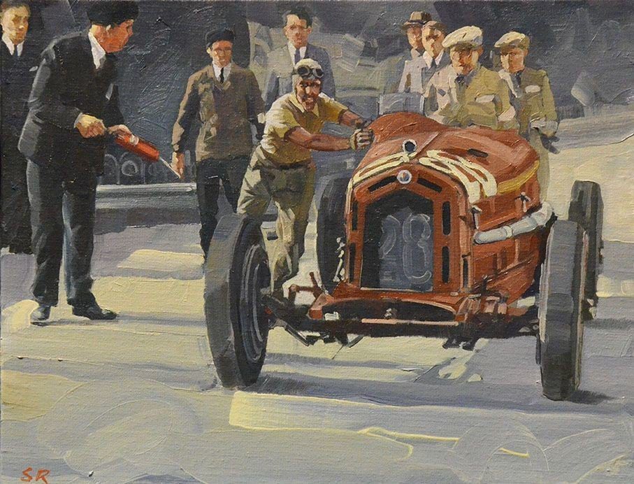 En dehors de ce thème spécifique, Stanley Rose continue de proposer sa propre vision de la course, notamment sur des toiles de petite taille, traitées à la brosse et baignées d’une lumière impressionniste, comme ce Nuvolari poussant son Alfa Romeo avec la dernière énergie (« J’adore les années d’avant-guerre, et puis ces petits formats sont plus abordables pour beaucoup de gens »). Un livre rétrospectif, « Wheels of life », est à paraître début juillet chez Jamval Editions.