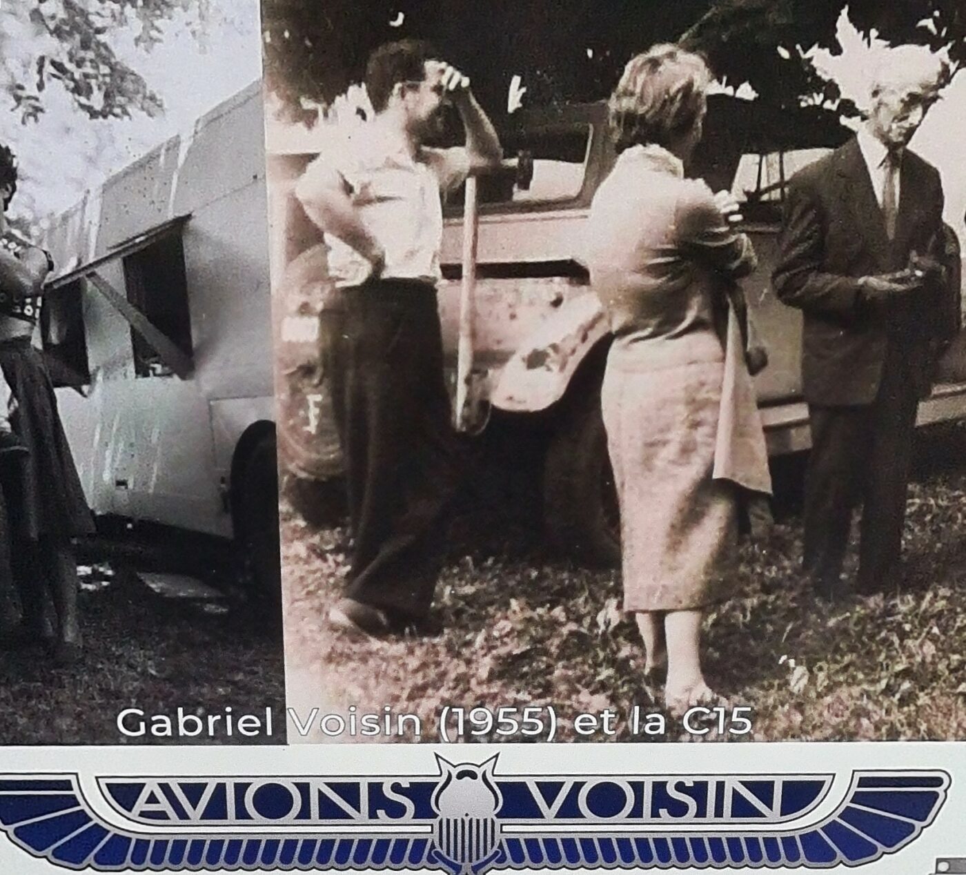 Dans cette histoire il y a le génie et la personnalité de Gabriel Voisin. Prenons le Petit Duc. Une voiture des années 30 utilisées jusqu’en 1955 et qui fut sa dernière voiture. On la voit en photo avec Voisin lui – même. Elle n’est pas en très bon état. Et pour cause : elle lui a servi de voiture expérimentale. Toujours contrarié par les problèmes de transmission résultant du faible couple du moteur à explosion, il est revenu au cours de la guerre, en 1941, sur la solution du moteur à vapeur. Ensuite elle fut dotée d’un moteur 3L pour pouvoir tracter sa caravane. Quant au coffre qu’on aperçoit, il était destiné à recueillir son matériel de pêche. Depuis elle a été restaurée.