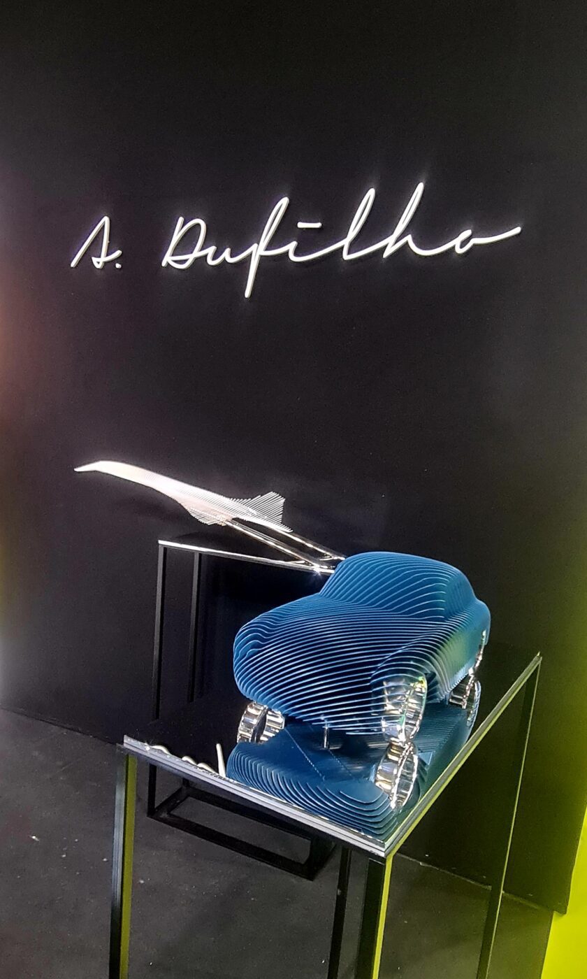 Antoine Dufilho est autodidacte, il expérimente différentes techniques telles que le moulage et la soudure pour bâtir progressivement l’esthétique de son art au- tour de cet ADN qui le caractérise ; il commence à s’y consacrer pleinement en 2012. Son travail consiste à exposer une alternance de plein et de vide, matérialisant un squelette, décomposant les formes en strates successives. Un mouvement est créé par cette représentation séquencée. C’est donc une vision cinétique d’un objet statique que nous offre l’artiste, notamment grâce à la déambulation de son observateur, qui permet une interprétation différente en fonction de son point d’observation. L’effet dynamique est accentué par une alternance de symétries et d’asymétries, provoquant un effet d’accélération ou de décélération. (Présentation du site de l’artiste)