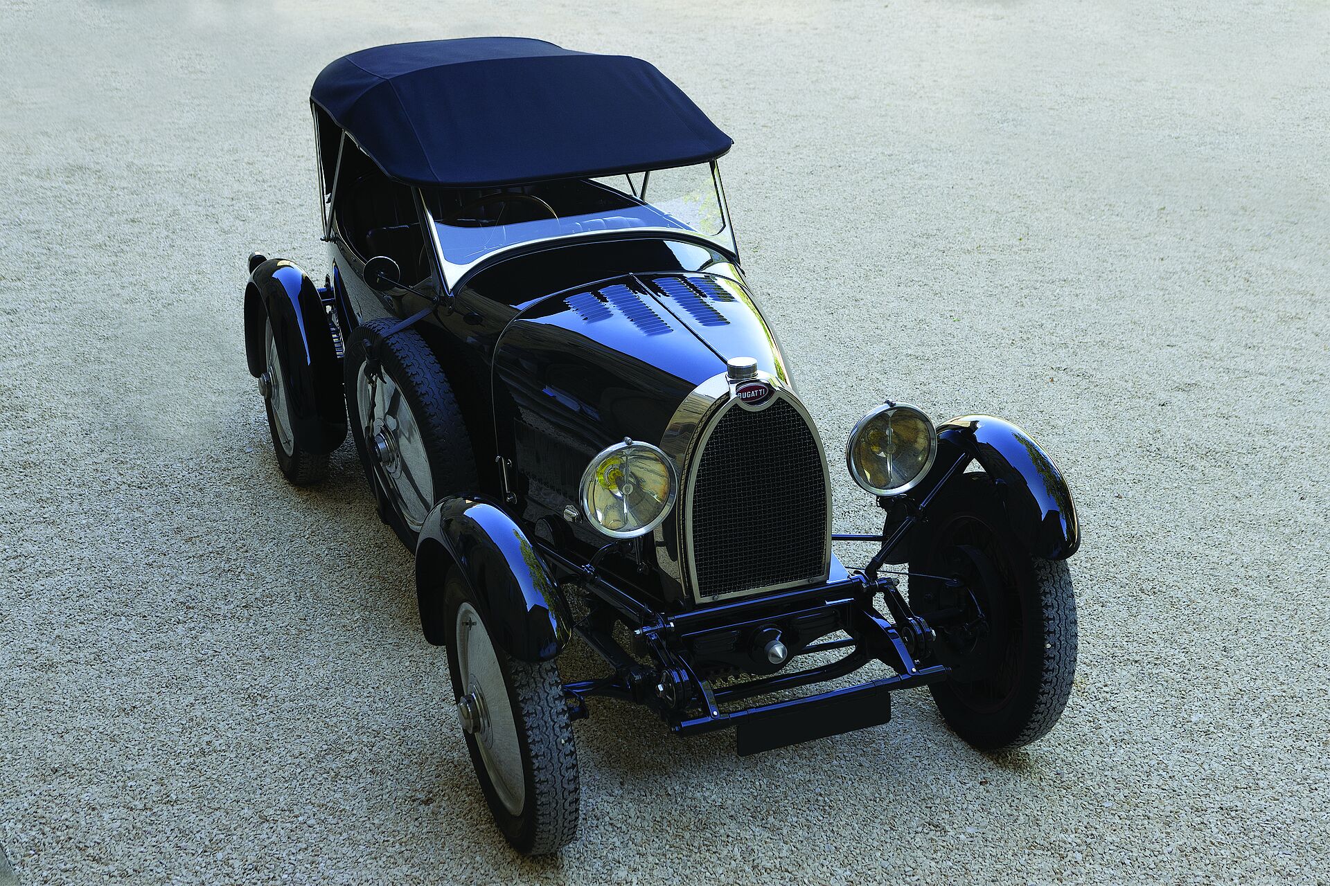 Il fallait absolument une carrosserie « fiacre », un ou deux modèles « Grand Prix », évidemment, c’est le centenaire de la 35 cette année comme on l’a déjà dit, j’en ai trouvé une du Grand Prix de Lyon 1924 et une à compresseur. J’ai la chance d’avoir un ami qui possède l’ancienne Bugatti 43 du Roi des Belges, Léopold II et par ailleurs Bruno Vendiesse qui nous prête une 57 et un Brescia. Je voulais aussi une voiture de jeunesse de Bugatti. La première sur laquelle il a travaillé, un tricycle Prinetti & Stucchi, qui est en Suisse et date de 1899. Son propriétaire a accepté de nous le confier. Et il y a enfin la Bugatti 56 électrique de 1931. Dix ont été fabriquées. Il en reste quatre au monde et c’est la seule dans une collection privée.