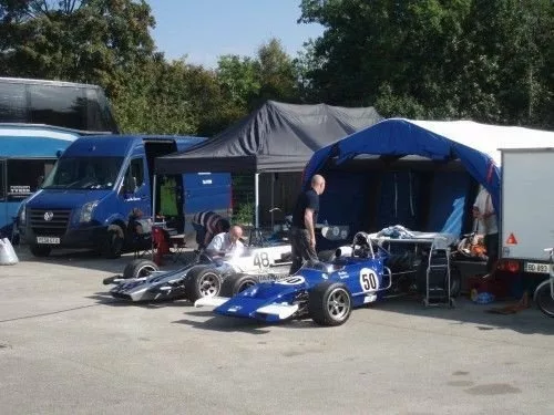 Si les F2 sont sans conteste le clou du week-end, si les F3-1000 cc forment un bel essaim hurleur, le reste est moins attractif : quelques protos 2 litres, plusieurs jolies Crosslé et des Porsche et Viper assez récentes s’affrontent dans des courses disparates. L’affluence s’en ressent, elle est sans commune mesure avec celle qui garnissait les gradins lors de ma précédente visite, pour le GP de l’Age d’Or, l’année dernière. De même, hormis pour se sustenter ou pour s’équiper de pied en cap chez les vendeurs de Stand 21 venus en voisins, inutile de chercher un stand marchand : pas de miniatures, pas de livres. Ah si, pardon ! en plein milieu du paddock on retrouve une tête connue : venu tout exprès de sa Normandie au volant de son speedster Opel, Philippe Vogel dédicace ses productions, évidemment vêtu de sa combinaison au nom de Mike Beuttler. Satisfait, il me confie en fin de journée qu’il a rarement eu autant de succès. Il a même vendu un exemplaire de son livret de photos Diapotos sur Dijon à un Suisse qui a reconnu la Chevron qu’il pilotait aux 1000 km en 1975 ! Un grand écart temporel qui n’est pas si rare : ainsi, Robert nous raconte qu’un voisin de paddock est venu le voir pour lui dire qu’il connaissait sa March parfaitement, et pour cause : il était le mécano de Jean-Pierre Jaussaud chez Marcel Arnold en 1971 !