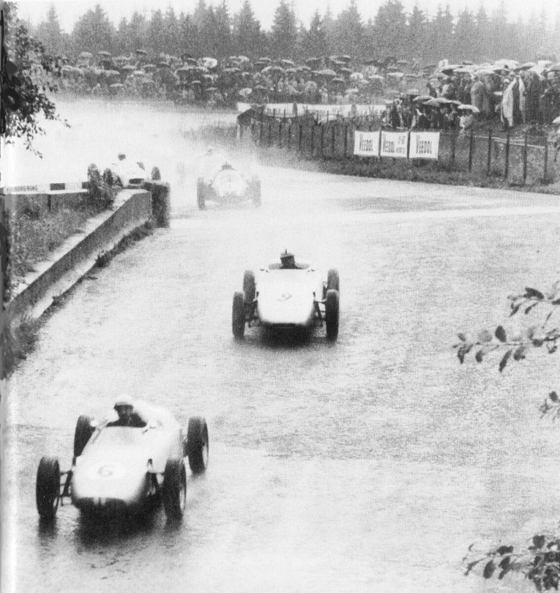 Le départ fut donné sous une pluie battante et dans une brouillasse tenace, tellement que par endroits, les pilotes se guidaient uniquement grâce à leur (faible) connaissance du circuit. Et à ce jeu, Bonnier et Von Trips prirent d’entrée l’avantage. Brabham joua la prudence et suivit sagement le train des monoplaces allemandes, attendant l’éventuelle faute. Il menait au championnat et une troisième place dans ces conditions détestables lui convenait parfaitement après ses succès à Bruxelles et Pau. En deuxième position, Von Trips sentait de mieux en mieux sa voiture et se rapprochait sérieusement de Bonnier. C’est comme ça qu’au huitième tour, lui vint l’idée saugrenue de doubler le Suédois et de passer ainsi devant le stand Porsche éberlué.